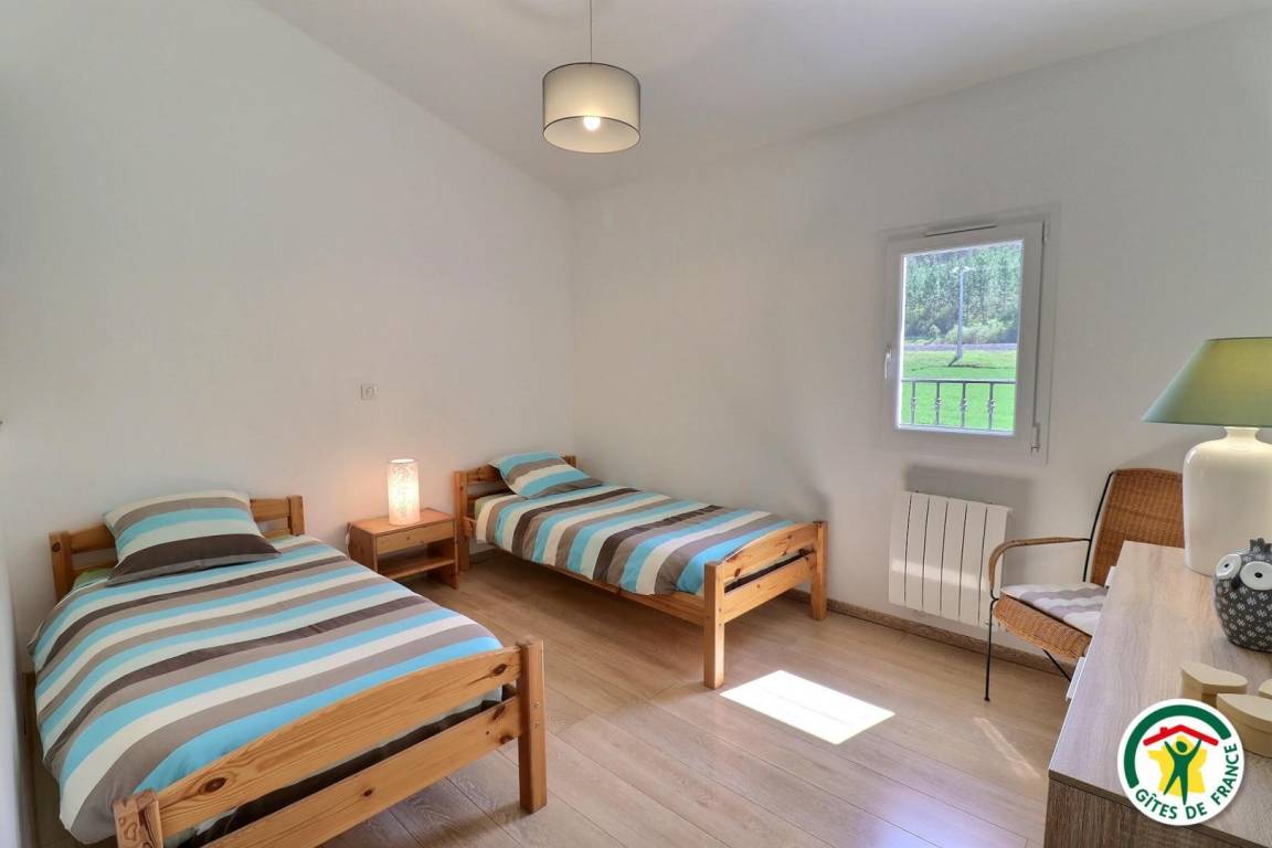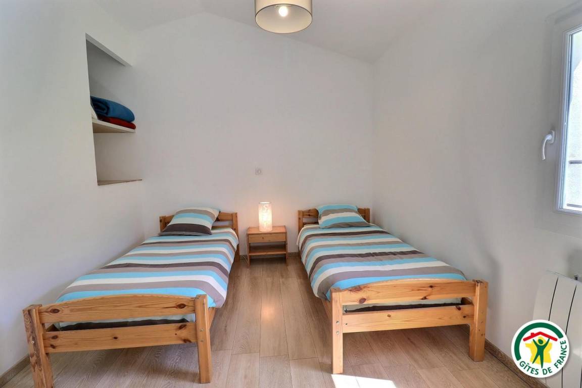 Im Erdgeschoss befindet sich eine komplett ausgestattete Einbauküche, 1 Wohnzimmer, 1 Schlafzimmer (1 Bett 160 cm) und 1 Bad mit Dusche. Im Obergeschoss liegt ein 2. Schlafzimmer (2 Betten 90 cm). Der Swimmingpool (5 x 10 m) wird gemeinsam mit einer zweiten Ferienunterkunft benutzt. Eigener Garten mit schattiger Terrasse unter einer Gartenlaube. In der Nähe einer kleinen Eisenbahn.