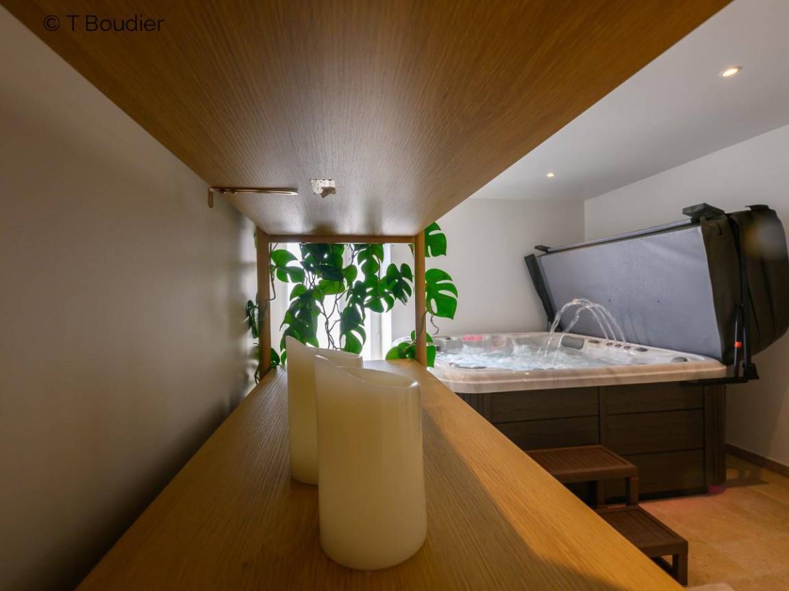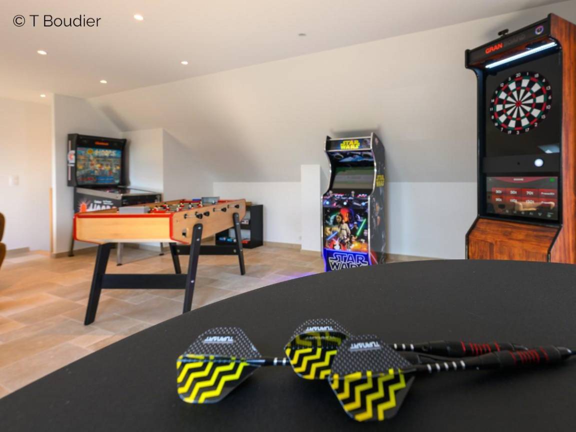 Einfamilienhaus. Wohnzimmer (TV, Internet, Bluetooth-Lautsprecher). Offene Küche zum Wohnzimmer (Induktionskochfeld, elektrischer Ofen, Mikrowelle, Geschirrspüler, amerikanischer Kühlschrank, Roboter, Espressomaschine). Sekundäre Küche mit Zugang zur Terrasse (Kochen, Kühlschrank mit Gefrierfach, Waschmaschine, Trockner). WC unabhängig. Badezimmer. Im Obergeschoss, Schlafzimmer 1 (Bett 180x200, TV) privates Badezimmer. Schlafzimmer 2 (Bett 180x200, TV), Schlafzimmer 3 (2 lits100x200, TV), Schlafzimmer 4 (Bett 180x200, TV). Separates WC. Privater Innenpool in der Verlängerung des Hauses (beheizt, 8x4m, mit Dusche). Überdachte Terrasse mit Kamin. Gartenmöbel. In einem Nebengebäude: Fitnessraum, Spa und Sauna mit Sanitäranlagen und Spielzimmer im Obergeschoss (Tischfußball, Flipper, Arcade) mit Wohnzimmer und Küchenzeile. Privater geschlossener Innenhof. Garten. Petanque-Platz. Bettwäsche, Handtücher und Pool vorhanden. Betten bei der Ankunft gemacht. Aerothermische Heizung inbegriffen.