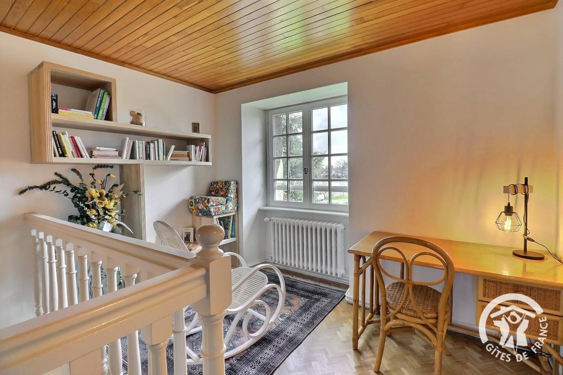 - ein Treppenabsatz mit Büro und Bibliothek