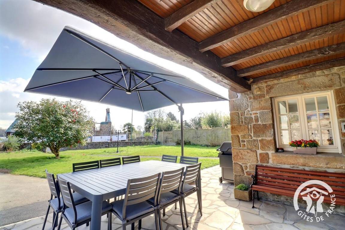 - Eine Terrasse mit Gartenmöbeln, Sonnenschirm und Grill
