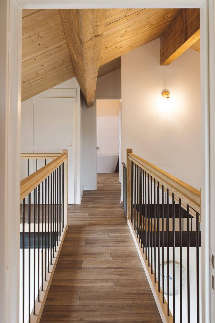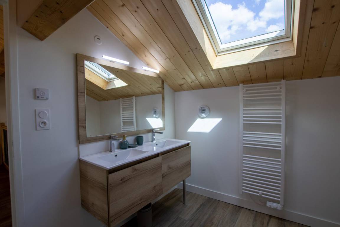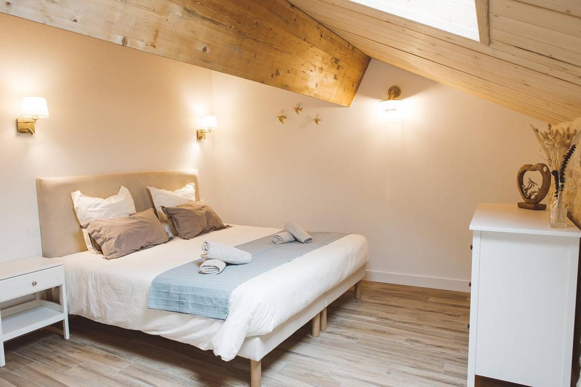 Im Obergeschoss (15 Stufen) bewohnen Sie ein Schlafzimmer mit 1 180x200-Bett, ein Schlafzimmer mit 2 90x200-Betten, die Sie zusammenstellen können, ein Badezimmer und eine separate Toilette.