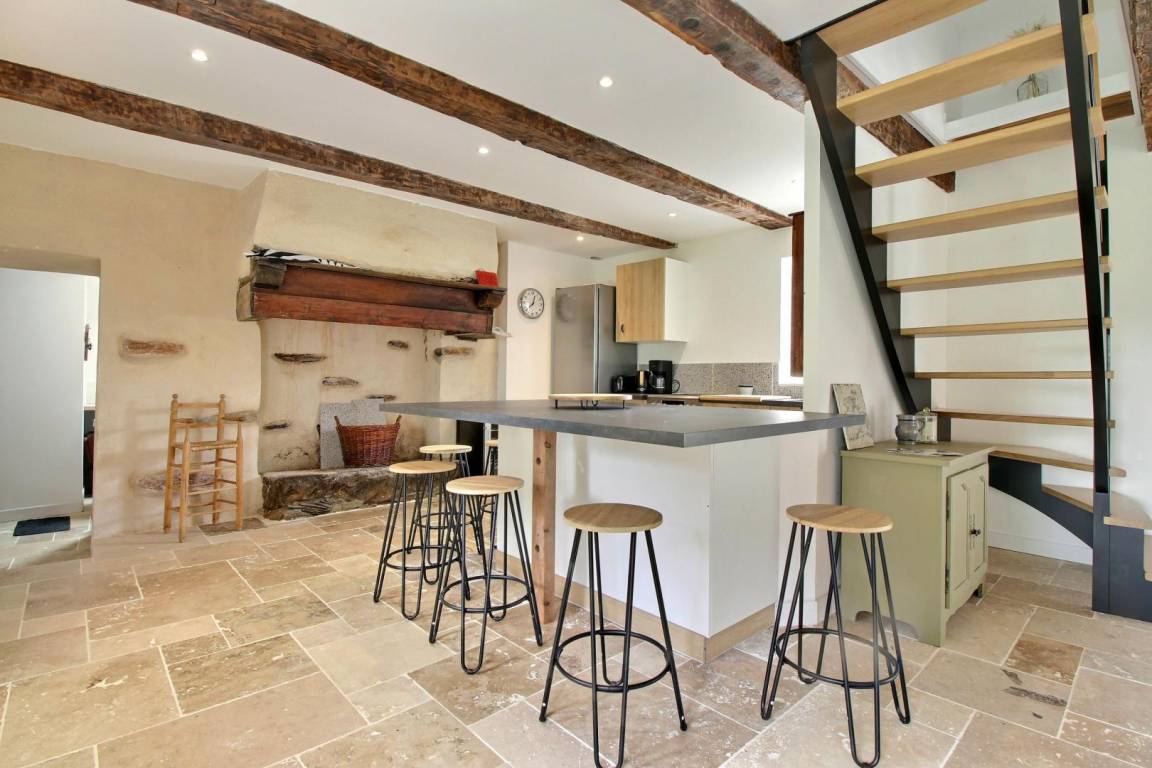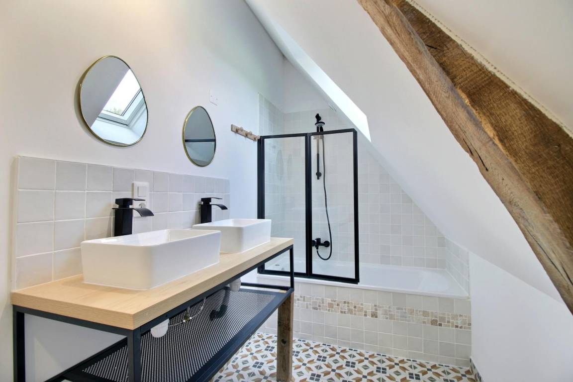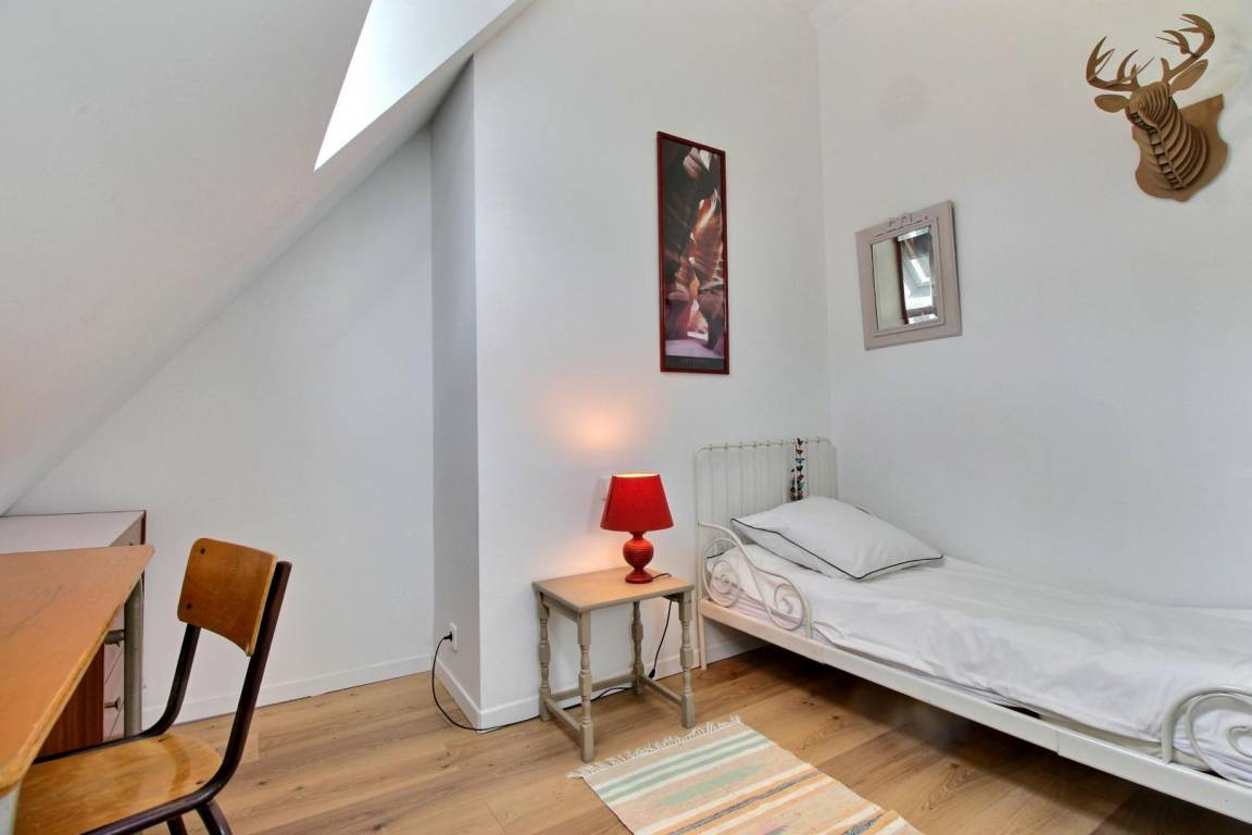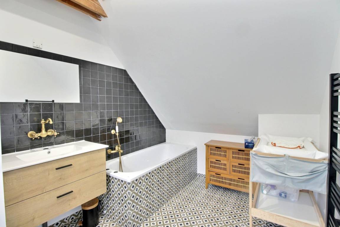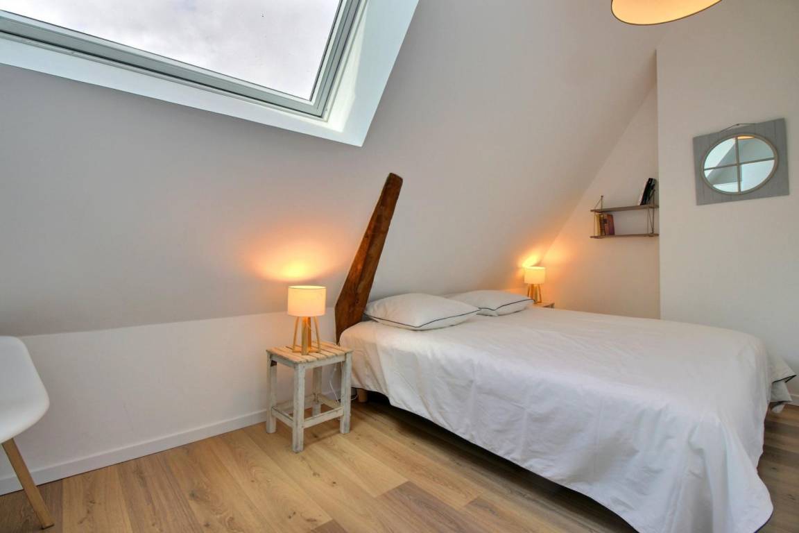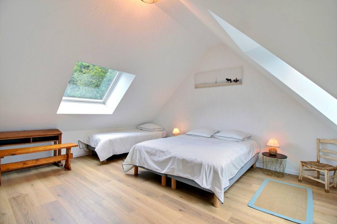 Im Obergeschoss führt eine erste Treppe zu einem Schlafzimmer (1 160-cm-Bett und 1 80-cm-Bett) und einem Badezimmer mit Toilette. Eine 2. Treppe führt zu 3 Schlafzimmern (1 90-cm-Bett, 2 160-cm-Betten), einem Badezimmer und einer Toilette.