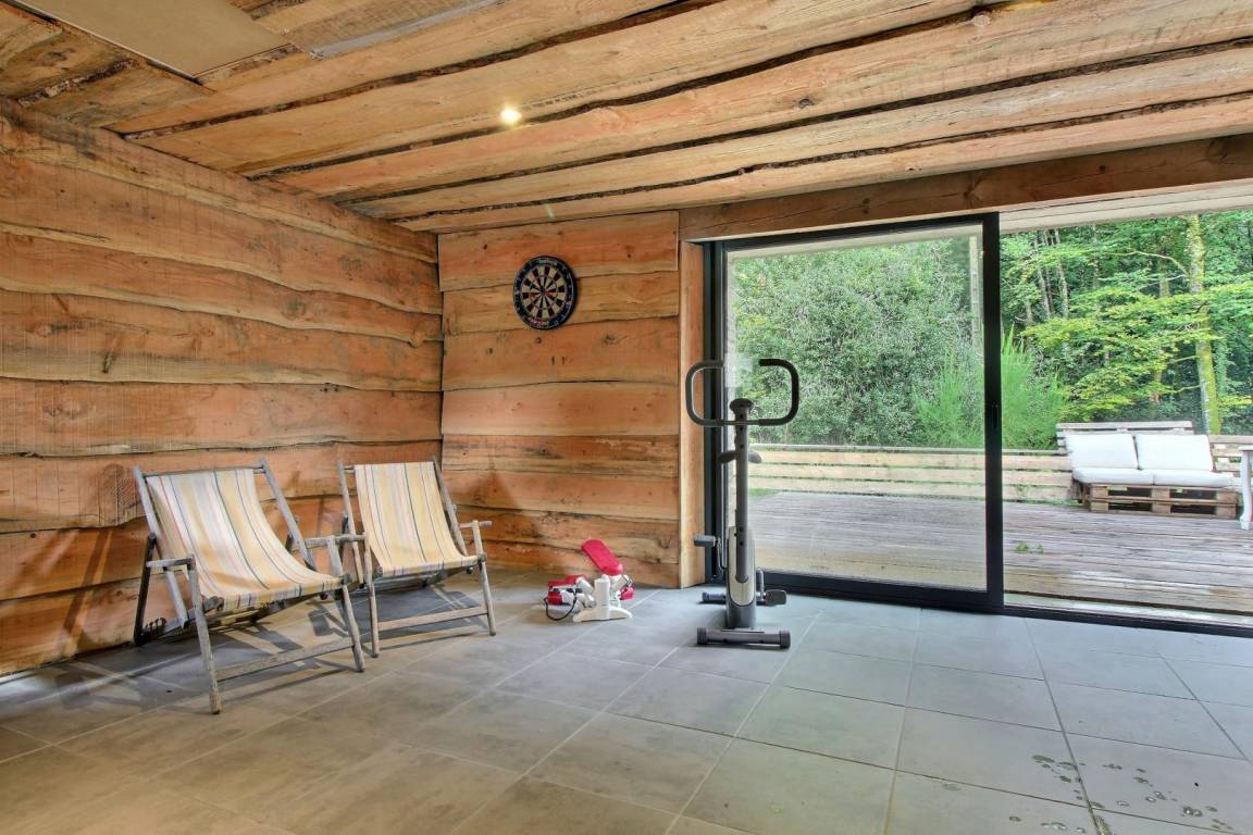 Über die Terrasse gelangen Sie zum Wellnessbereich mit Spa und Sportgeräten (Fahrrad und Stepper).