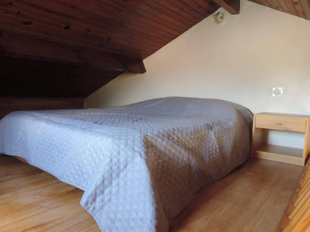 1 Schlafzimmer mit Schlafgelegenheit für 3 Personen (1 Doppelbett) + im Zwischengeschoss (1 Doppelbett) mit Fräsleiter, mit begrenzter Höhe (Kindergröße), Zugang vom Schlafzimmer.