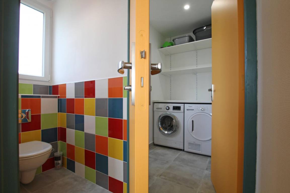 Freistehendes Haus. Erdgeschoss: Wohnzimmer mit Sitzecke (Orange TV mit ausländischen Sendern, DVD-Player, Stereoanlage, ADSL-Internet). Offene Küche (Induktionskochfeld, Backofen, Mikrowelle, Espressomaschine, Geschirrspüler, Kühl-/Gefrierkombination). WC. Duschbad mit Waschküche (Waschbecken, Dusche, Handtuchwärmer, Waschmaschine, Wäschetrockner). Obergeschoss: Schlafzimmer 1 (1 Doppelbett 160x200 cm). Schlafzimmer 2 (4 Einzelbetten 90x190 cm). Badezimmer (Waschbecken, Badewanne). WC. Privater, umzäunter Garten mit Tor. Terrasse mit Blick auf die Wiese (mit Pferden). Gartenmöbel. Sonnenliegen. Grill. Parkplatz. Überdachter Pavillon. Tischtennisplatte. Kegelbahn und Boulebahn. Elektrische Heizung ist nicht im Preis inbegriffen. Bettwäsche und Handtücher werden gestellt. Die Betten sind bei Ankunft bezogen. Reinigungsservice optional. Babyausstattung vor Ort verfügbar. Ermäßigter Preis für 2 Haustiere.