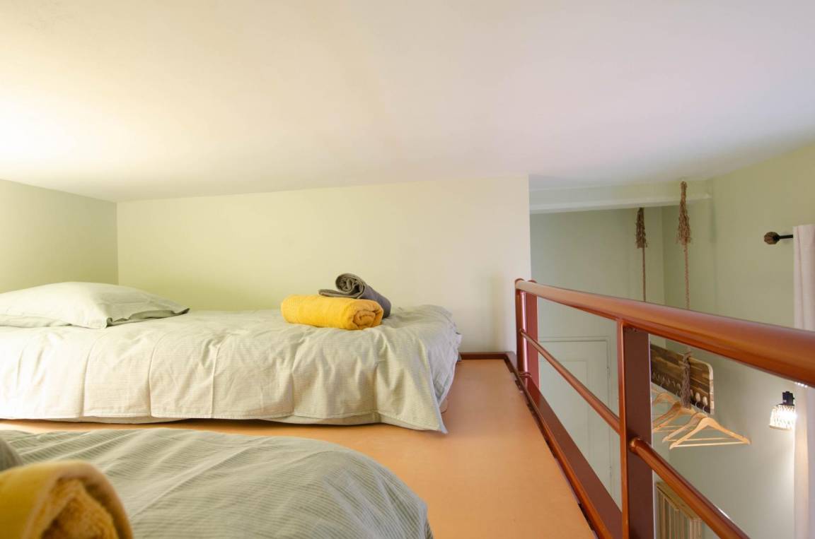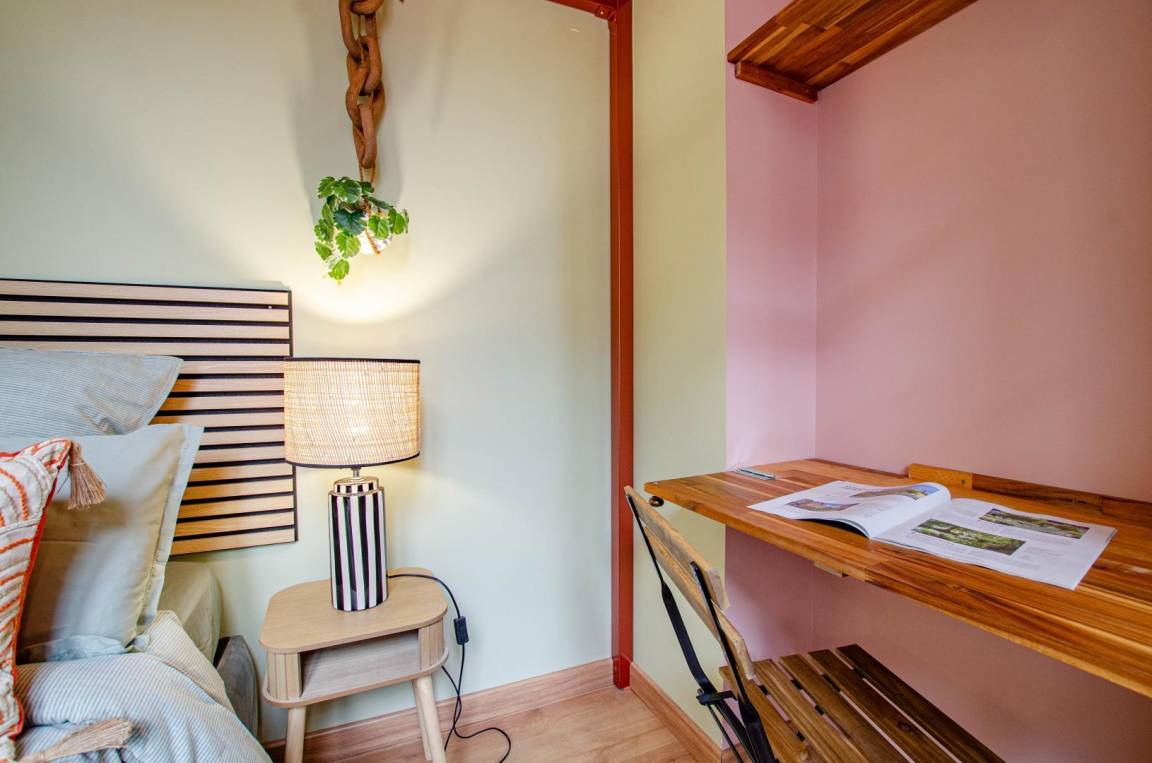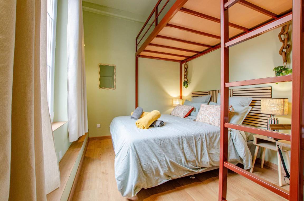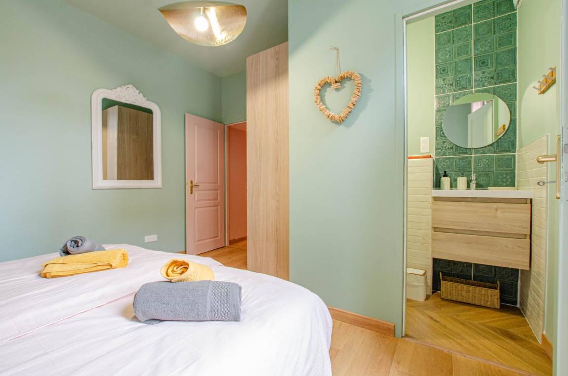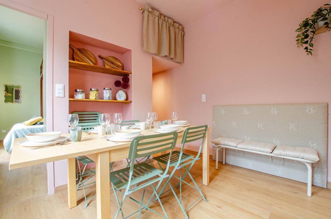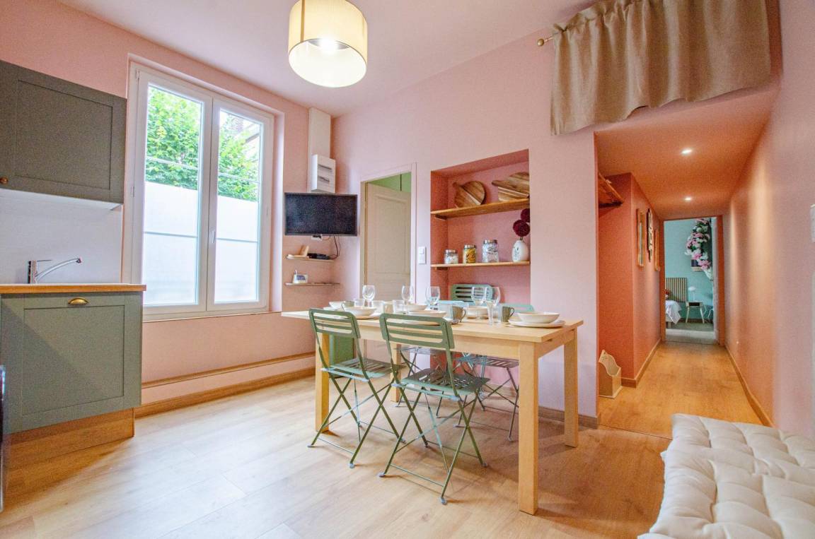 „Jolie petit studio aux couleurs pastels. Chambres spacieuses. Située dans une impasse, donc très calme. Manque un espace salon, un espace cosy avec canapé pour partager des moments entre amis, en famille.“