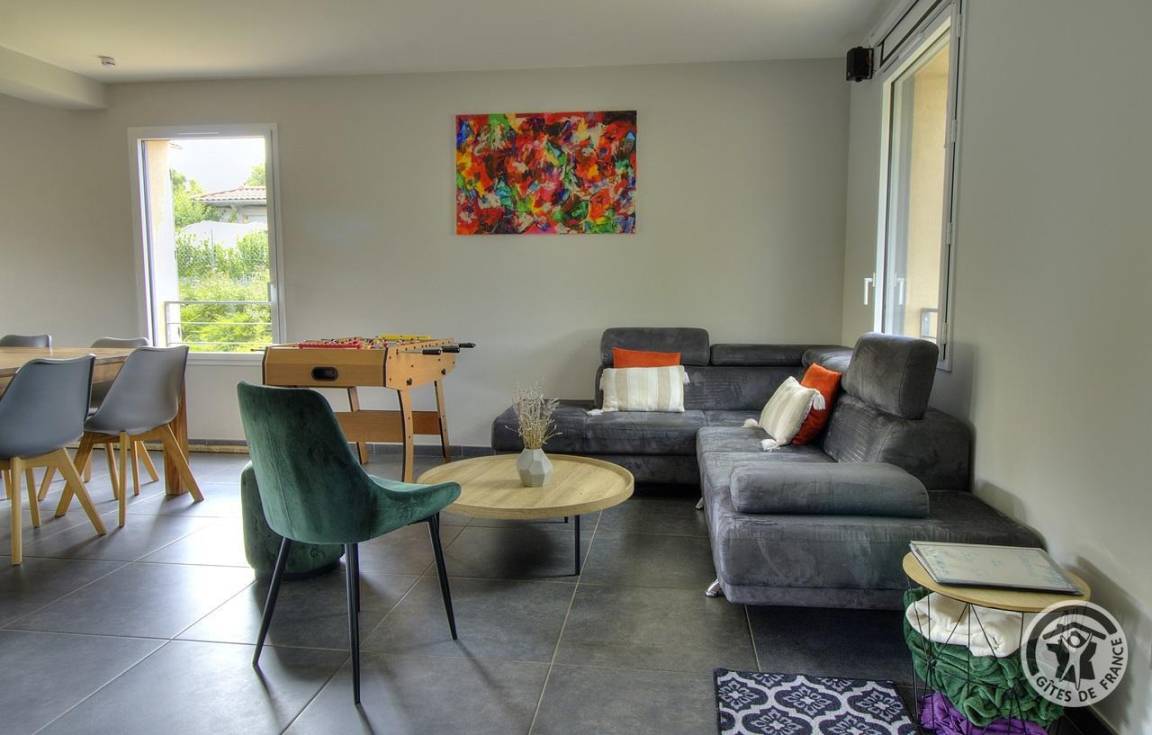 „Le gîte de l'amandier est un gîte très fonctionnel. Il est très propre, l'intérieur est moderne et très bien agencé. Il dispose d'une très belle terrasse couverte. La pièce de vie est spacieuse et lumineuse et la cuisine très fonctionnelle. Une salle de bain moderne, très propre et avec des toilettes pour chacune des chambres de 5, c'est très appréciable. Le seul petit bémol serait sur les lits (d'où le 4/5), surtout pour les couples (deux lits de 80cm mais des petites couettes séparées qui ne bordent pas assez) . Les propriétaires sont accueillants et discrets mais restent très disponibles à la demande. Le propriétaire, producteur de vin, met des bouteilles à disposition dans une cave à vin, ce qui est très sympa pour goûter son vin. Nous avons passé un très bon séjour à 14 dans ce gîte.“