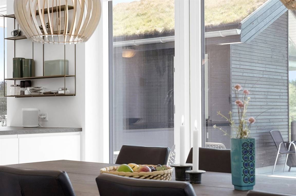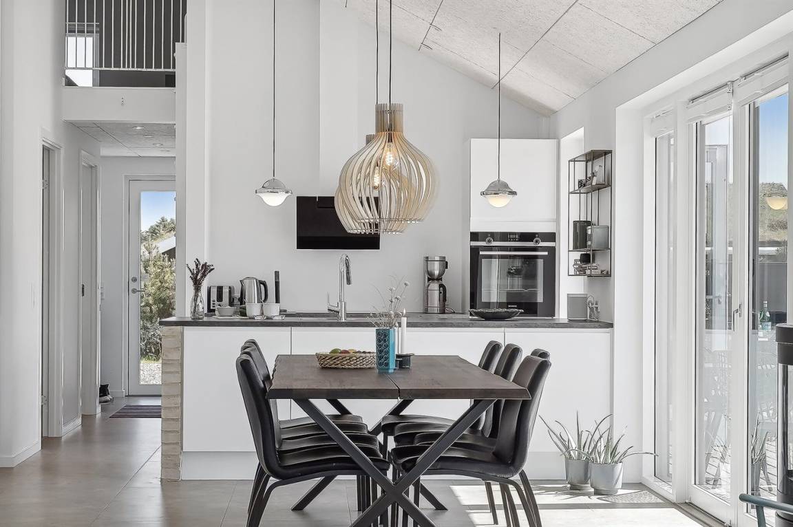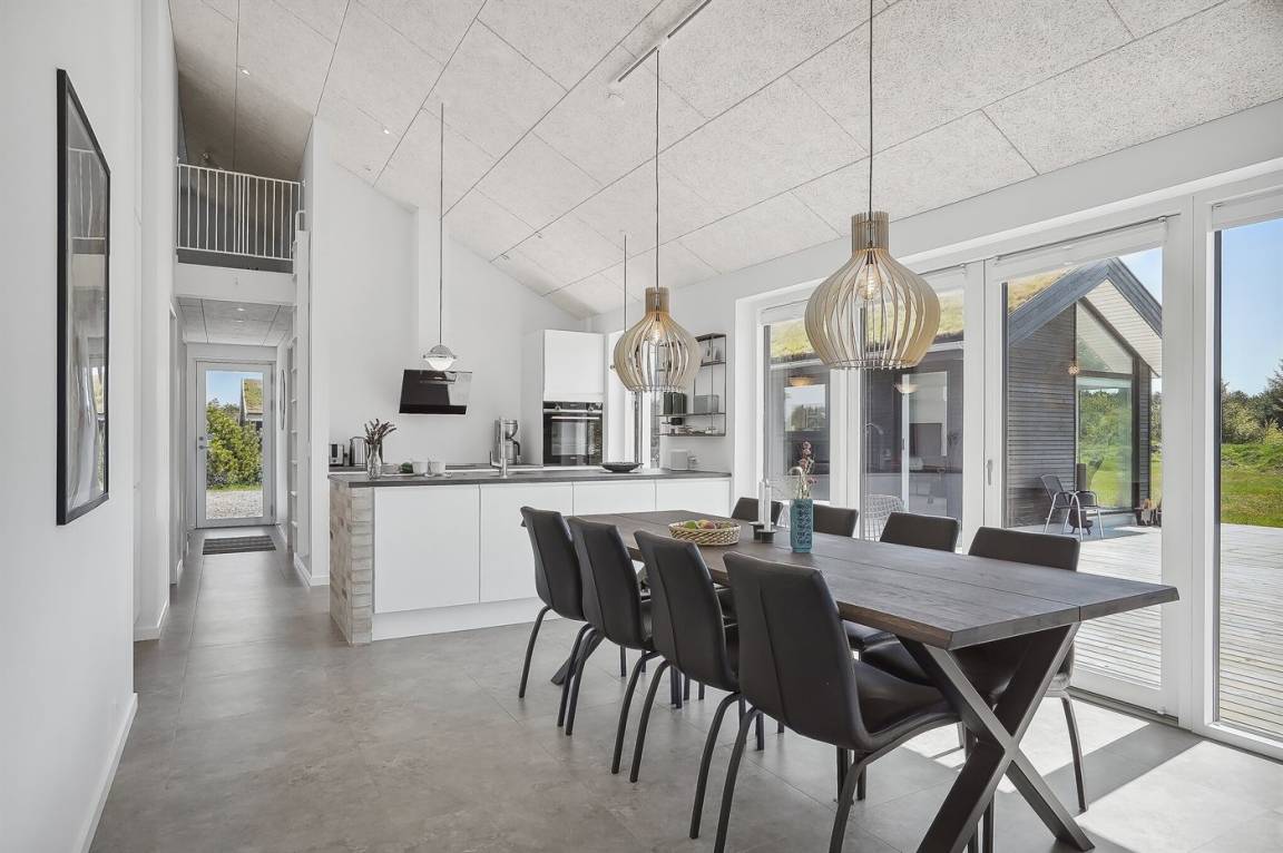 In der Wohnküche finden Sie einen Esstisch mit Platz für 8-10 Personen und es stehen 2 Kinderstühle zur Verfügung. Das Ferienhaus hat Decken bis zum First und einen offenen Zugang zum Wohnzimmer.
