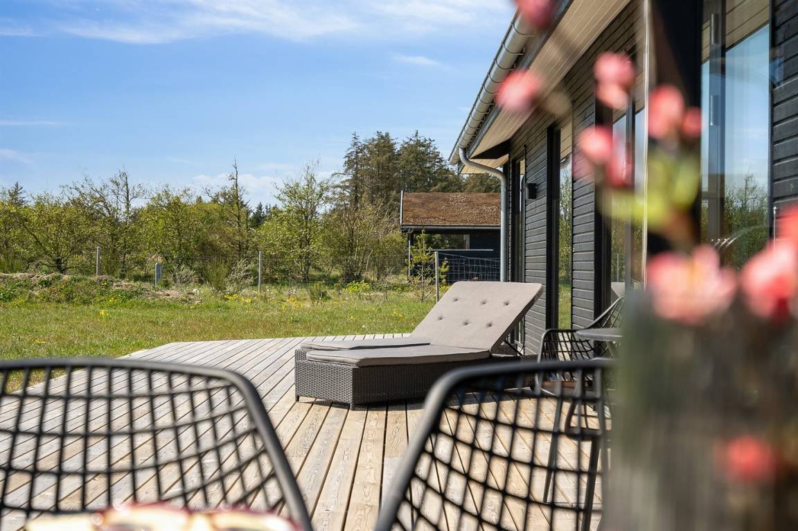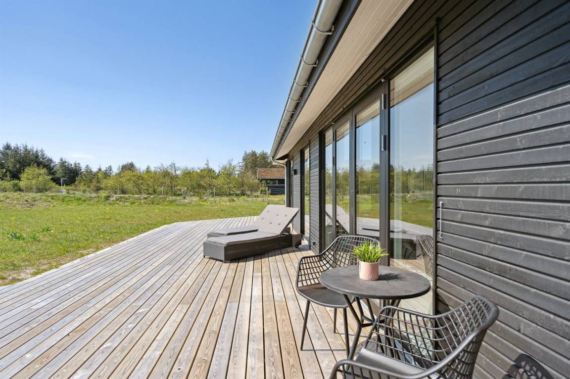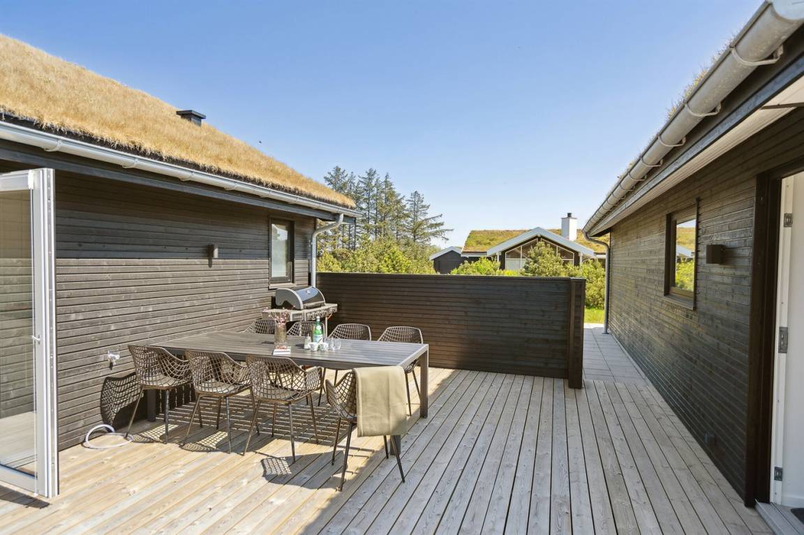 Zum Ferienhaus gehören eine 95 m² offene Terrassenfläche sowie eine 6 m² überdachte Terrasse mit Spotbeleuchtung. Das Ferienhaus verfügt darüber hinaus über Außenbeleuchtung auf allen Terrassen und es steht ein Grill zur Verfügung.