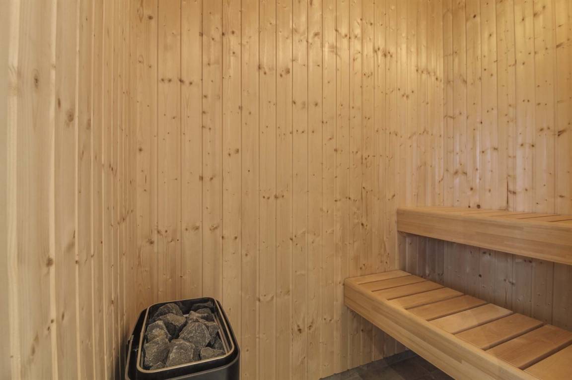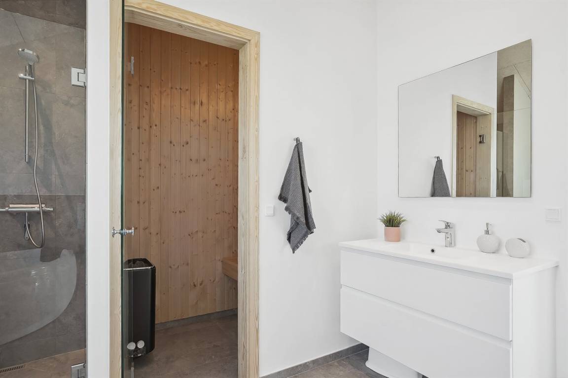 Es gibt 2 Badezimmer, beide mit Doppelduschen und Fußbodenheizung. Enspannen Sie sich im warmen Wasser des Whirlpools oder genießen Sie einen Aufenthalt in der Sauna.
