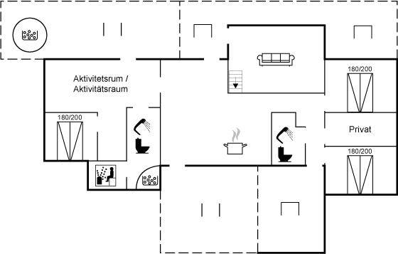 DraußenDie Ferienunterkunft liegt auf einem 2131 m² großen Dünengrundstück. Die Entfernung zum Meer beträgt 600 m. Die nächste Einkaufsmöglichkeit liegt 6000 m entfernt. Es steht ein offenes Terrassenareal zur Verfügung. Außerdem gibt es überdachte Terrasse. Geräteraum. Außendusche. Es steht ein Grill zur Verfügung. Es ist ein Ladestecker für Elektroautos installiert. CEE Stecker. Parkplatz auf dem Grundstück.
