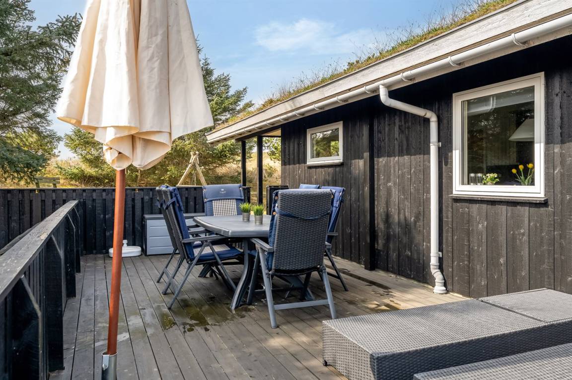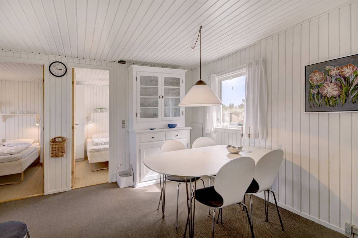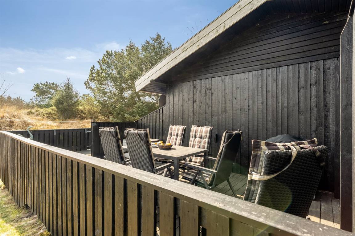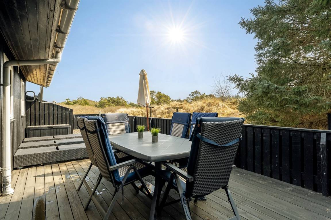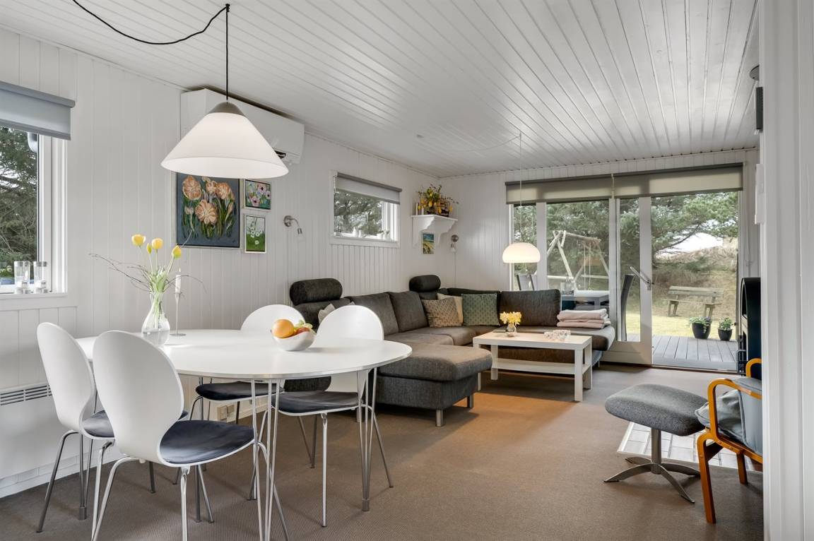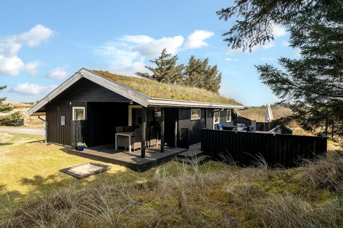 Dieses gemütliche und neu renovierte Ferienhaus liegt dicht an einem geschützten, hügeligen Gemeinschaftsgelände. Zum Haus gehören sowohl offene als auch überdachte Terrassen mit Gartenmöbeln. Innen gibt es Holzdecken und -wände sowie Teppiche. Badezimmer mit Fußbodenheizung und Dusche. Separate Sauna. Die Küche ist u. a. mit Tiefkühlgerät, Herd mit Ceran-Feld, Mikrowelle und Geschirrspüler ausgestattet. Das sehr gemütliche und persönlich eingerichtete Wohnzimmer enthält TV mit digitalem Satellitenanschluss, DVD-Spieler und Stereoanlage mit CD-Spieler und Kaminofen (Kostenloses Brennholz steht zur Verfügung). Von dem Wohnzimmer Zutritt zur überdachten Terrasse. Die Schlafplätze des Hauses verteilen sich auf 3 Zimmer; 2 Zimmer mit Doppelbett und 1 Zimmer mit Etagenbett. Ferner kostenlose ADSL-Internetverbindung (Computer ist mitzubringen), komb. Waschmaschine/Wäschetrockner und Kinderbett zur Verfügung. Ein gemütliches Ferienhaus dicht an einem der besten Badestrände Dänemarks.