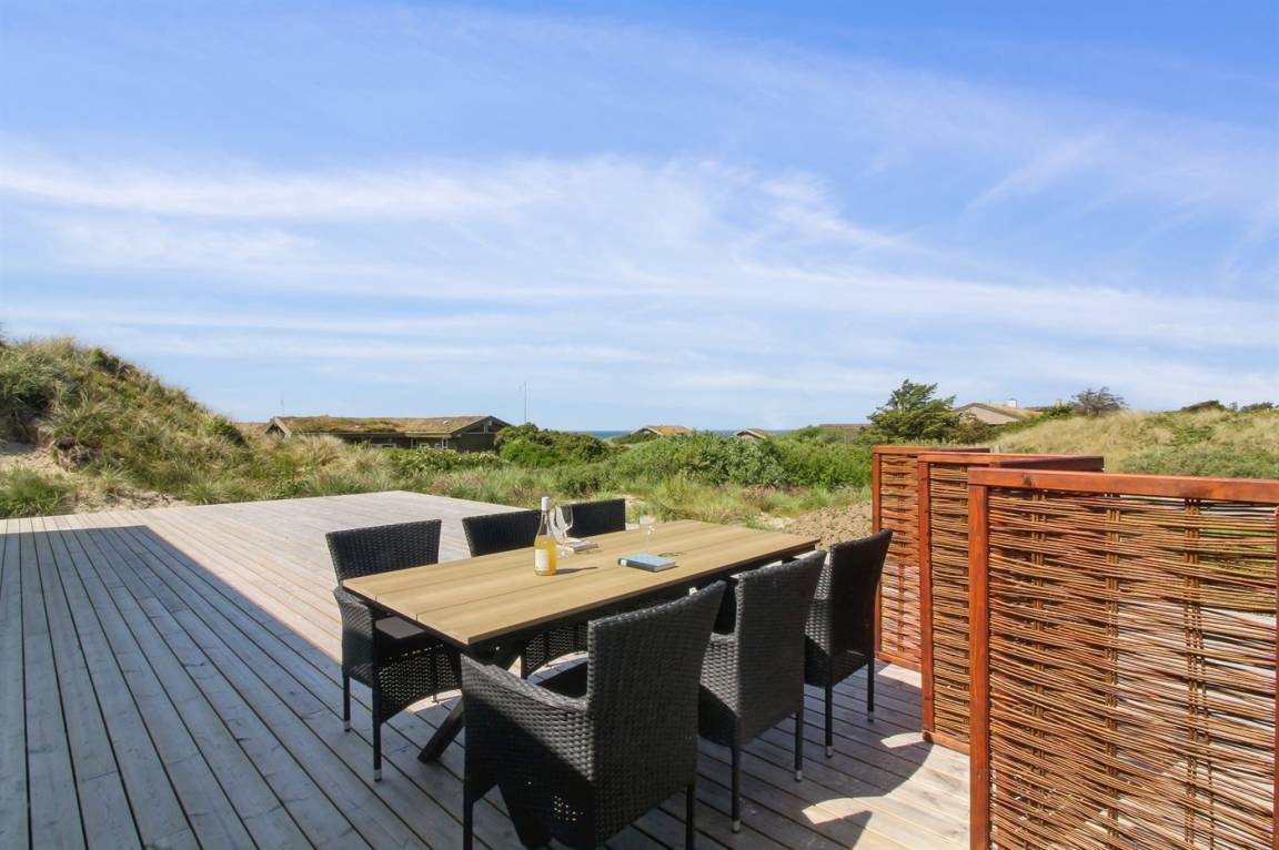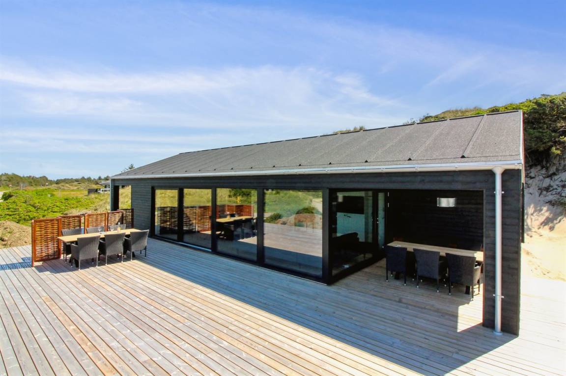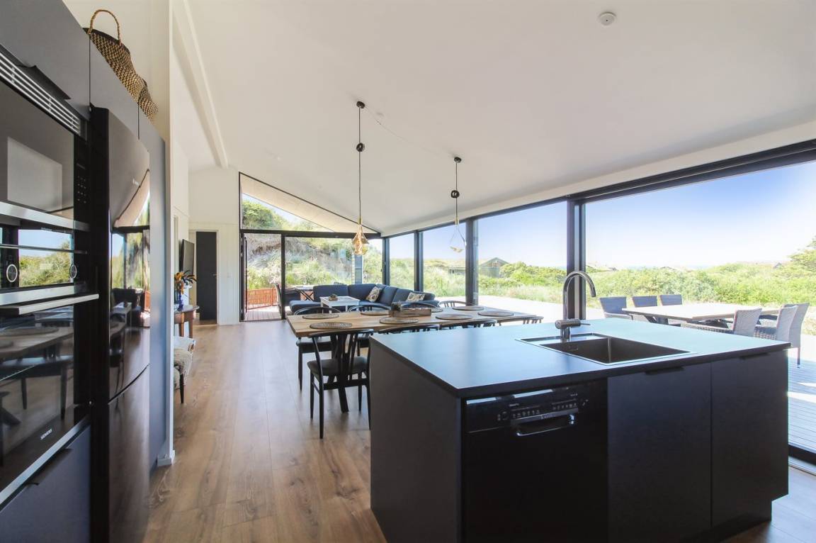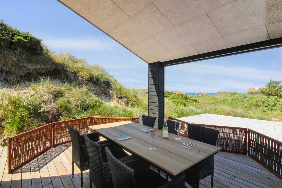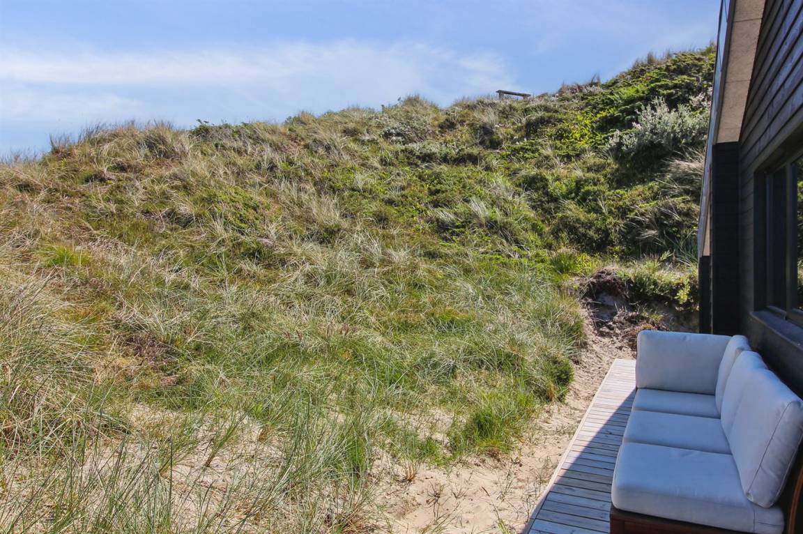 DraußenDie Ferienunterkunft liegt auf einem 2200 m² großen Dünengrundstück. Die Entfernung zum Meer beträgt 500 m. Die nächste Einkaufsmöglichkeit liegt 3000 m entfernt. In einem Abstand von 12000 m gibt es einen Golfplatz. Es steht ein 70 m² Terrassenareal zur Verfügung. Außerdem gibt es 20 m² überdachte Terrasse. Geräteraum. Es steht ein Grill zur Verfügung. Parkplatz auf dem Grundstück.