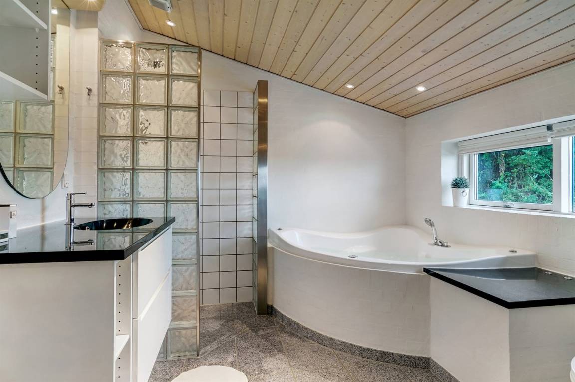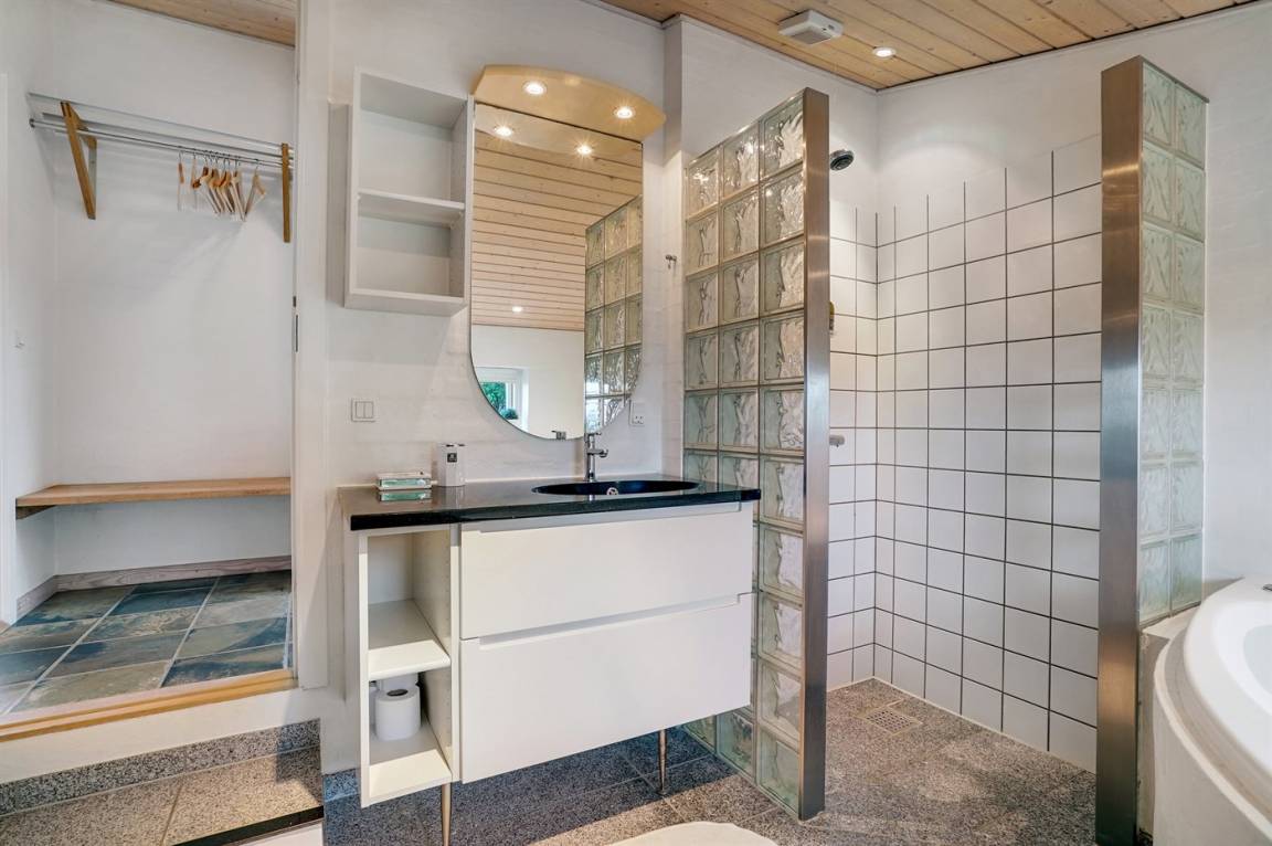 Ferienhaus mit einer einzigartigen Lage und Panoramaaussicht über das Meer und die Landschaft. Badezimmer in versetzter Ebene.