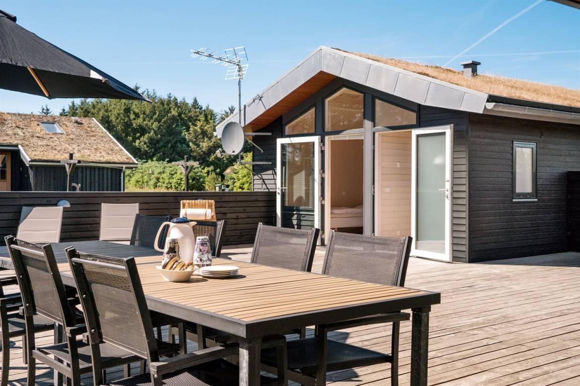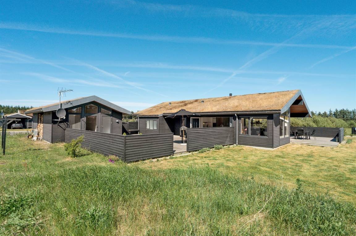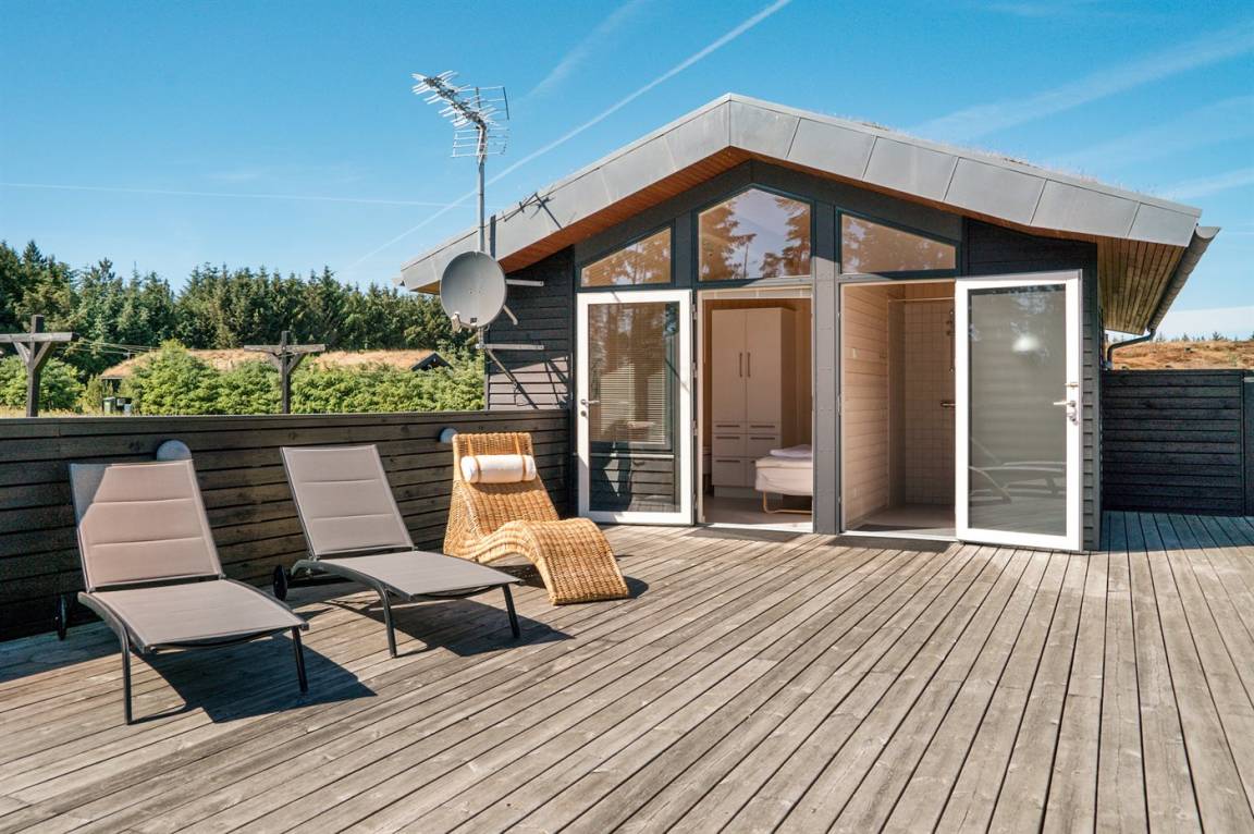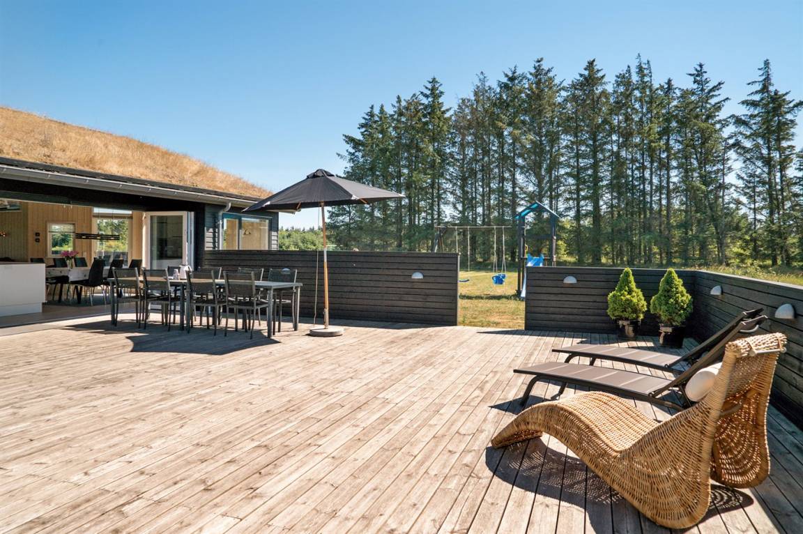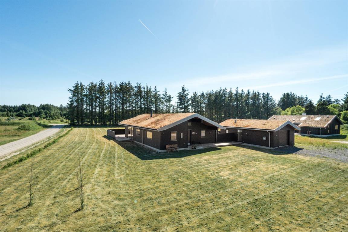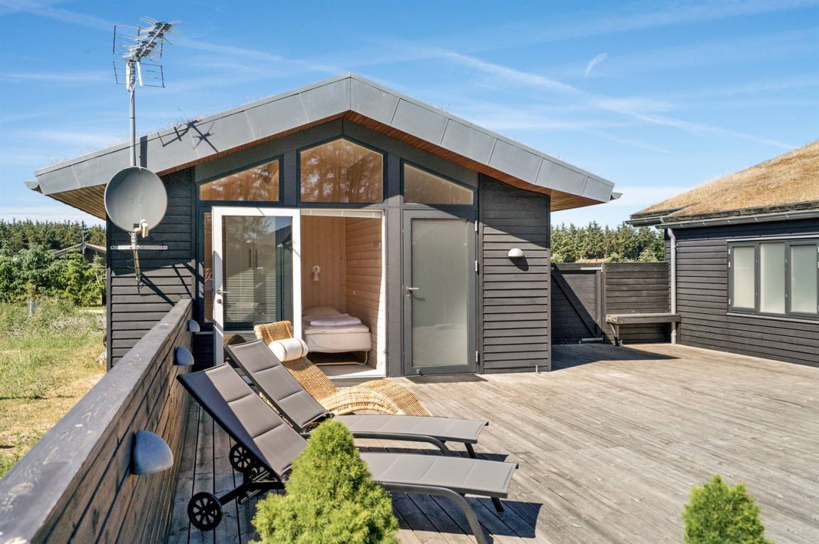 Großes, luxuriös ausgestattetes Ferienhaus aus Holz von 2009 mit Whirlpool und Sauna. Das Haus ist auf einem Naturgrundstück gebaut und von einem sehr großen und zum Teil überdachten Terrassenareal umgeben. Innen gibt es Klinkerböden, jedoch Holzböden in 2 Schlafzimmern. Geräumiges Badezimmer mit 2-Pers. Whirlpool, Sauna, Fußbodenheizung, Duschnische und Handtuchtrockner. Die herrliche Küche ist mit Geschirrspüler, Mikrowelle, Umluftofen, Tiefkühlgerät und Herd mit Ceran-Feld ausgestattet. Eine große Schiebetür vom Essplatz in der Küche und zur überdachten Terrasse macht es möglich, die Natur ins Haus zu lassen. Das luxuriös ausgestattete Wohnzimmer enthält Kaminofen, TV mit digitalem Satellitenanschluss und DVD-Spieler. Das Haus hat 2 Schlafzimmer mit Doppelbett und praktischem begehbarem Kleiderschrank sowie 1 Schlafzimmer mit 2 Einzelbetten. Darüber hinaus gibt es im Gästehaus 1 Schlafzimmer mit 2 Einzelbetten, TV und Playstation1 sowie Badezimmer mit Duschnische. Neben dem Gästehaus finden Sie einen Aktivitätsraum, der mit komb. Tischfußball/Tischtennis/Airhockey, Trimmrad, Rudermaschine und Musikanlage ausgestattet ist. Zur Ausstattung des Hauses gehören auch Kinderbett, Kinderhochstuhl, Waschmaschine und Wäschetrockner. Ein schönes Ferienhaus dicht an der Nordsee, am Vergnügungspark Fårup Sommerland und Waldgebiet gelegen.