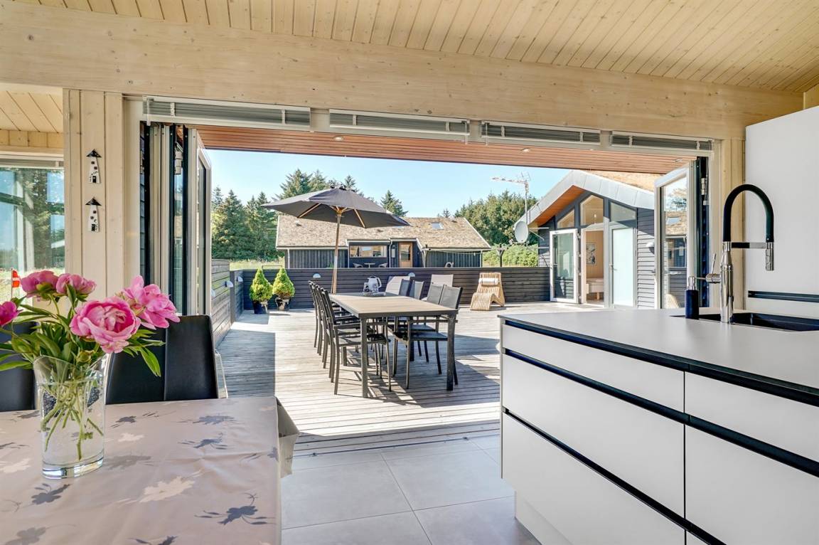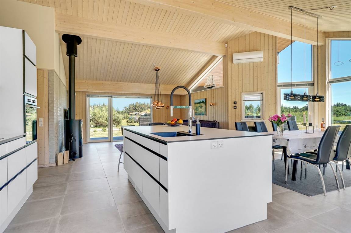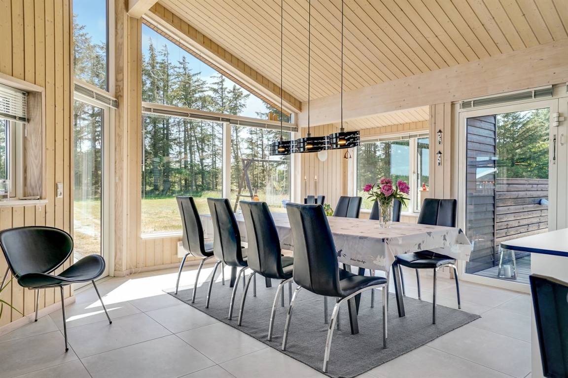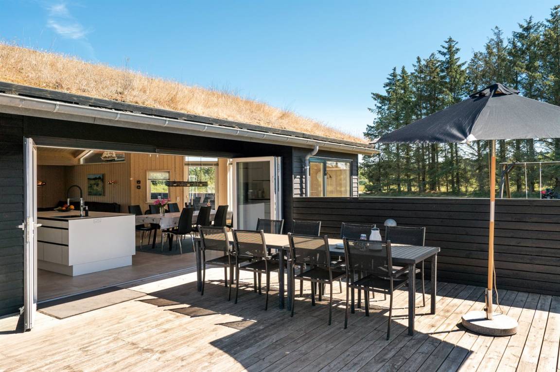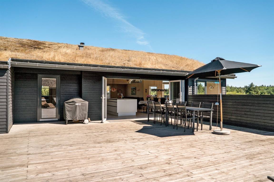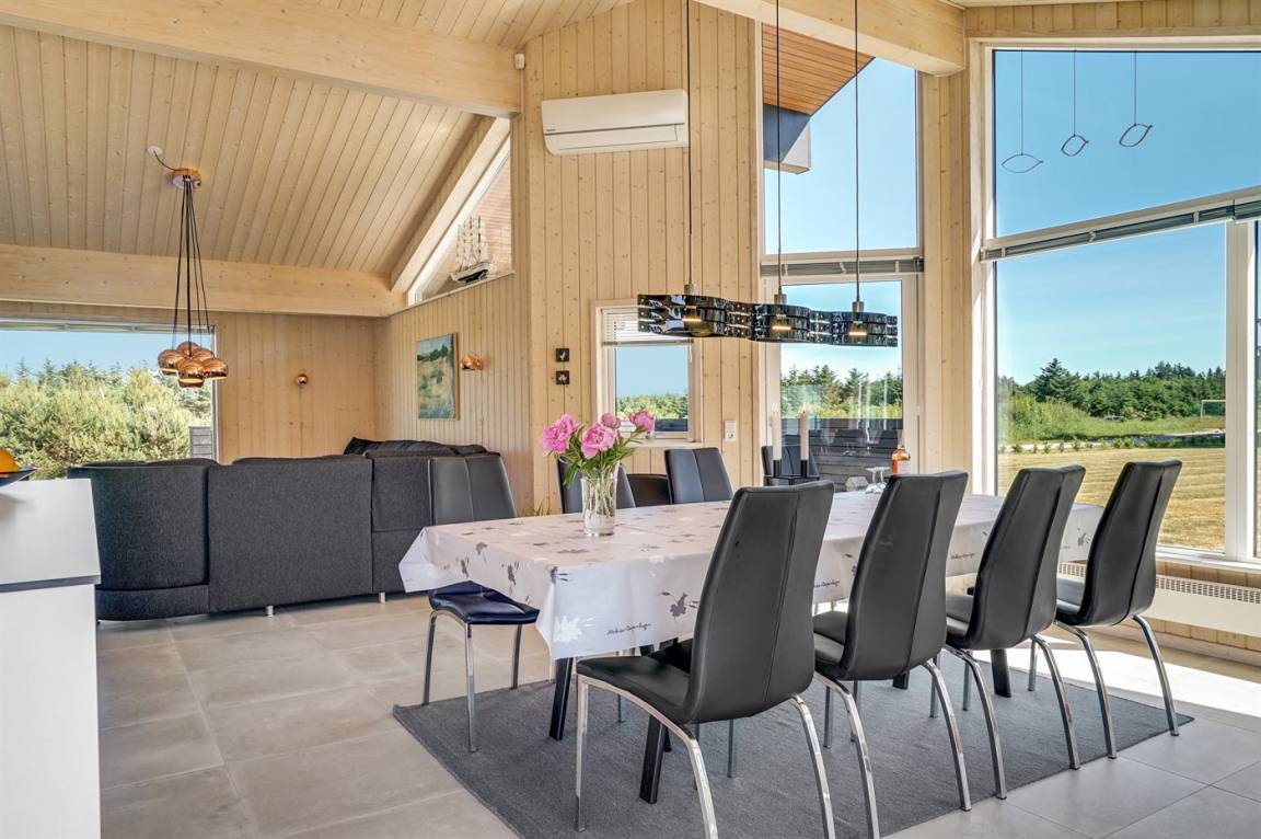Großes, luxuriös ausgestattetes Ferienhaus aus Holz von 2009 mit Whirlpool und Sauna. Das Haus ist auf einem Naturgrundstück gebaut und von einem sehr großen und zum Teil überdachten Terrassenareal umgeben. Innen gibt es Klinkerböden, jedoch Holzböden in 2 Schlafzimmern. Geräumiges Badezimmer mit 2-Pers. Whirlpool, Sauna, Fußbodenheizung, Duschnische und Handtuchtrockner. Die herrliche Küche ist mit Geschirrspüler, Mikrowelle, Umluftofen, Tiefkühlgerät und Herd mit Ceran-Feld ausgestattet. Eine große Schiebetür vom Essplatz in der Küche und zur überdachten Terrasse macht es möglich, die Natur ins Haus zu lassen. Das luxuriös ausgestattete Wohnzimmer enthält Kaminofen, TV mit digitalem Satellitenanschluss und DVD-Spieler. Das Haus hat 2 Schlafzimmer mit Doppelbett und praktischem begehbarem Kleiderschrank sowie 1 Schlafzimmer mit 2 Einzelbetten. Darüber hinaus gibt es im Gästehaus 1 Schlafzimmer mit 2 Einzelbetten, TV und Playstation1 sowie Badezimmer mit Duschnische. Neben dem Gästehaus finden Sie einen Aktivitätsraum, der mit komb. Tischfußball/Tischtennis/Airhockey, Trimmrad, Rudermaschine und Musikanlage ausgestattet ist. Zur Ausstattung des Hauses gehören auch Kinderbett, Kinderhochstuhl, Waschmaschine und Wäschetrockner. Ein schönes Ferienhaus dicht an der Nordsee, am Vergnügungspark Fårup Sommerland und Waldgebiet gelegen.