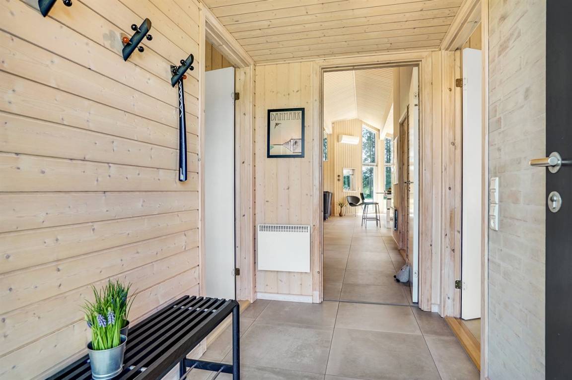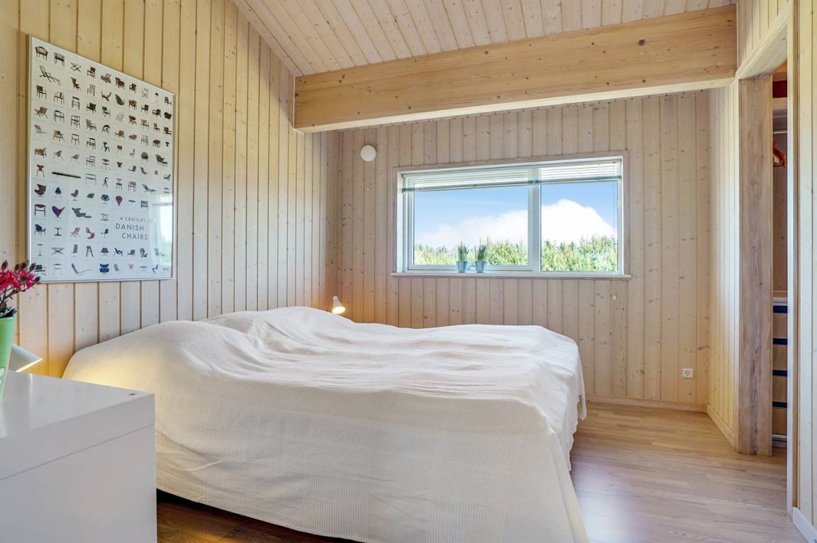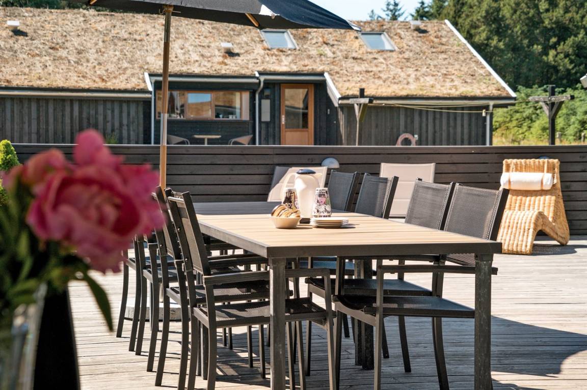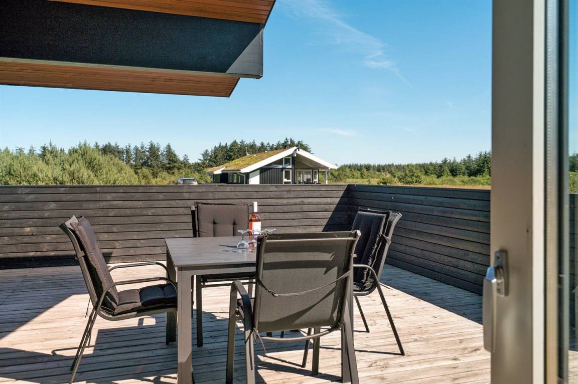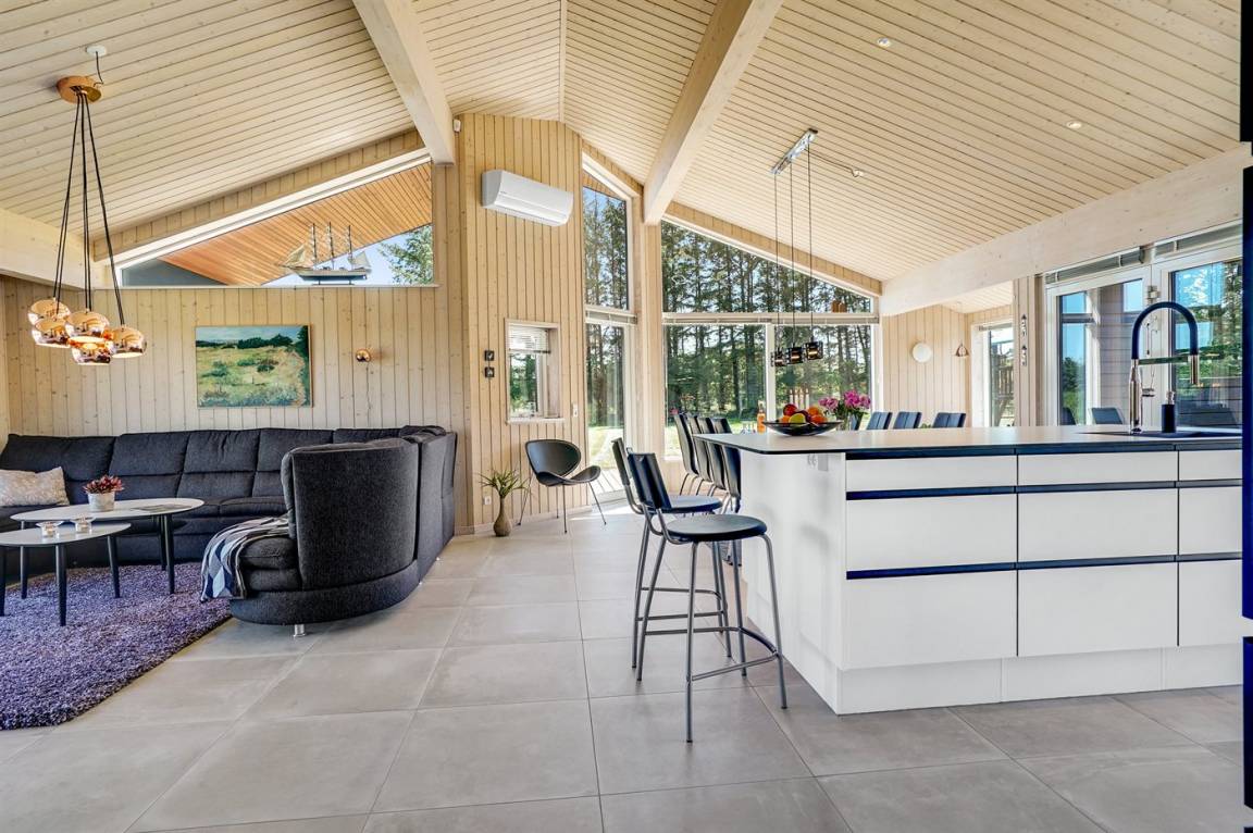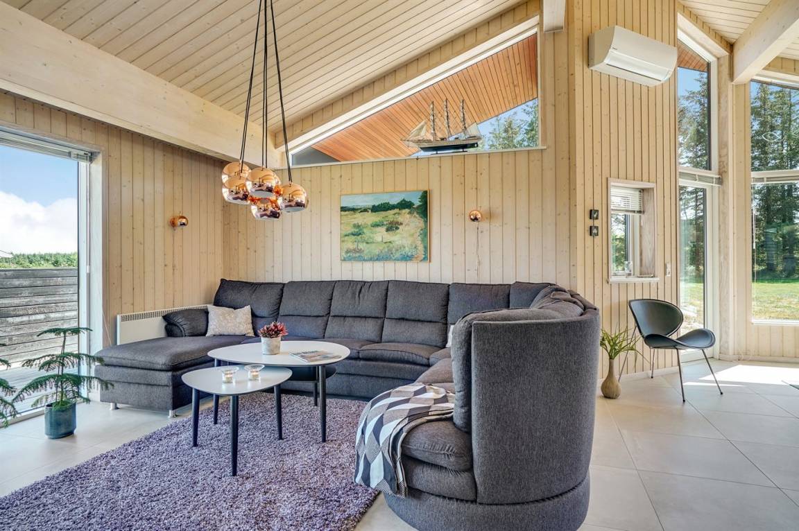 Großes, luxuriös ausgestattetes Ferienhaus aus Holz von 2009 mit Whirlpool und Sauna. Das Haus ist auf einem Naturgrundstück gebaut und von einem sehr großen und zum Teil überdachten Terrassenareal umgeben. Innen gibt es Klinkerböden, jedoch Holzböden in 2 Schlafzimmern. Geräumiges Badezimmer mit 2-Pers. Whirlpool, Sauna, Fußbodenheizung, Duschnische und Handtuchtrockner. Die herrliche Küche ist mit Geschirrspüler, Mikrowelle, Umluftofen, Tiefkühlgerät und Herd mit Ceran-Feld ausgestattet. Eine große Schiebetür vom Essplatz in der Küche und zur überdachten Terrasse macht es möglich, die Natur ins Haus zu lassen. Das luxuriös ausgestattete Wohnzimmer enthält Kaminofen, TV mit digitalem Satellitenanschluss und DVD-Spieler. Das Haus hat 2 Schlafzimmer mit Doppelbett und praktischem begehbarem Kleiderschrank sowie 1 Schlafzimmer mit 2 Einzelbetten. Darüber hinaus gibt es im Gästehaus 1 Schlafzimmer mit 2 Einzelbetten, TV und Playstation1 sowie Badezimmer mit Duschnische. Neben dem Gästehaus finden Sie einen Aktivitätsraum, der mit komb. Tischfußball/Tischtennis/Airhockey, Trimmrad, Rudermaschine und Musikanlage ausgestattet ist. Zur Ausstattung des Hauses gehören auch Kinderbett, Kinderhochstuhl, Waschmaschine und Wäschetrockner. Ein schönes Ferienhaus dicht an der Nordsee, am Vergnügungspark Fårup Sommerland und Waldgebiet gelegen.