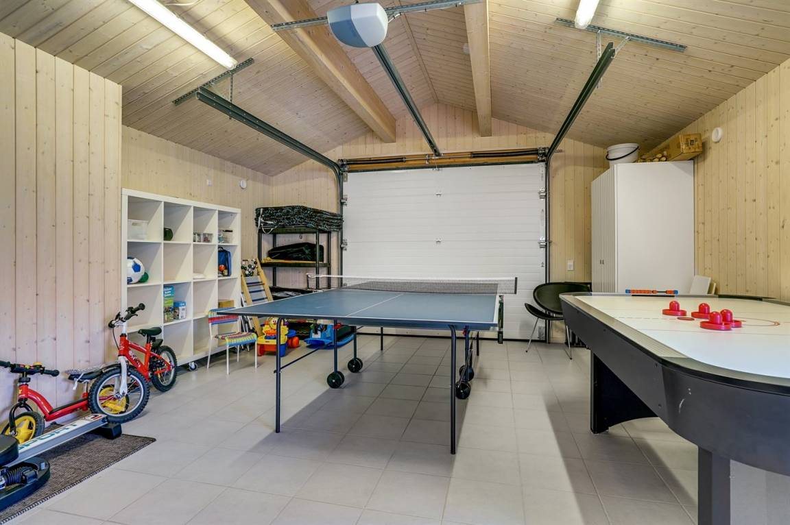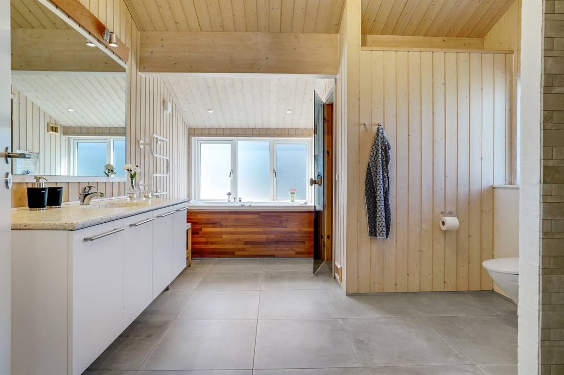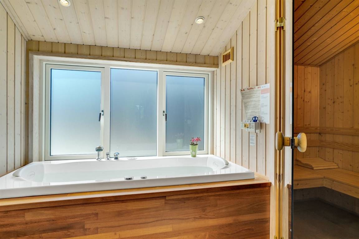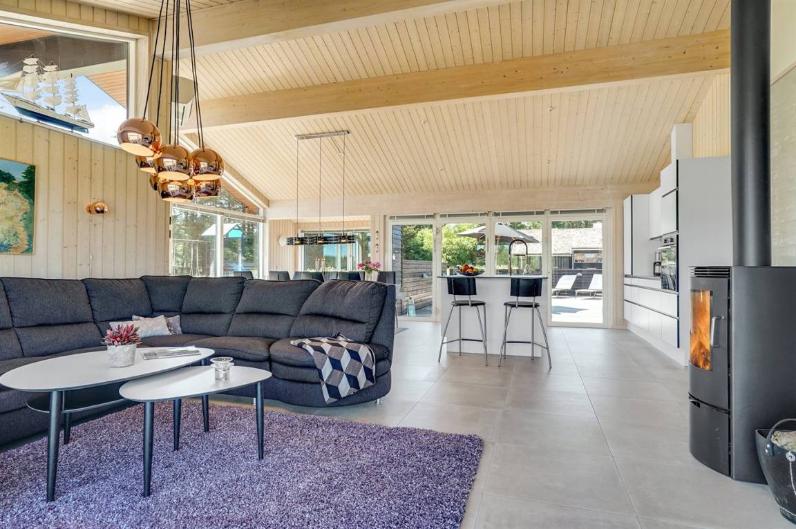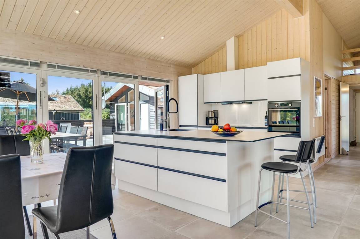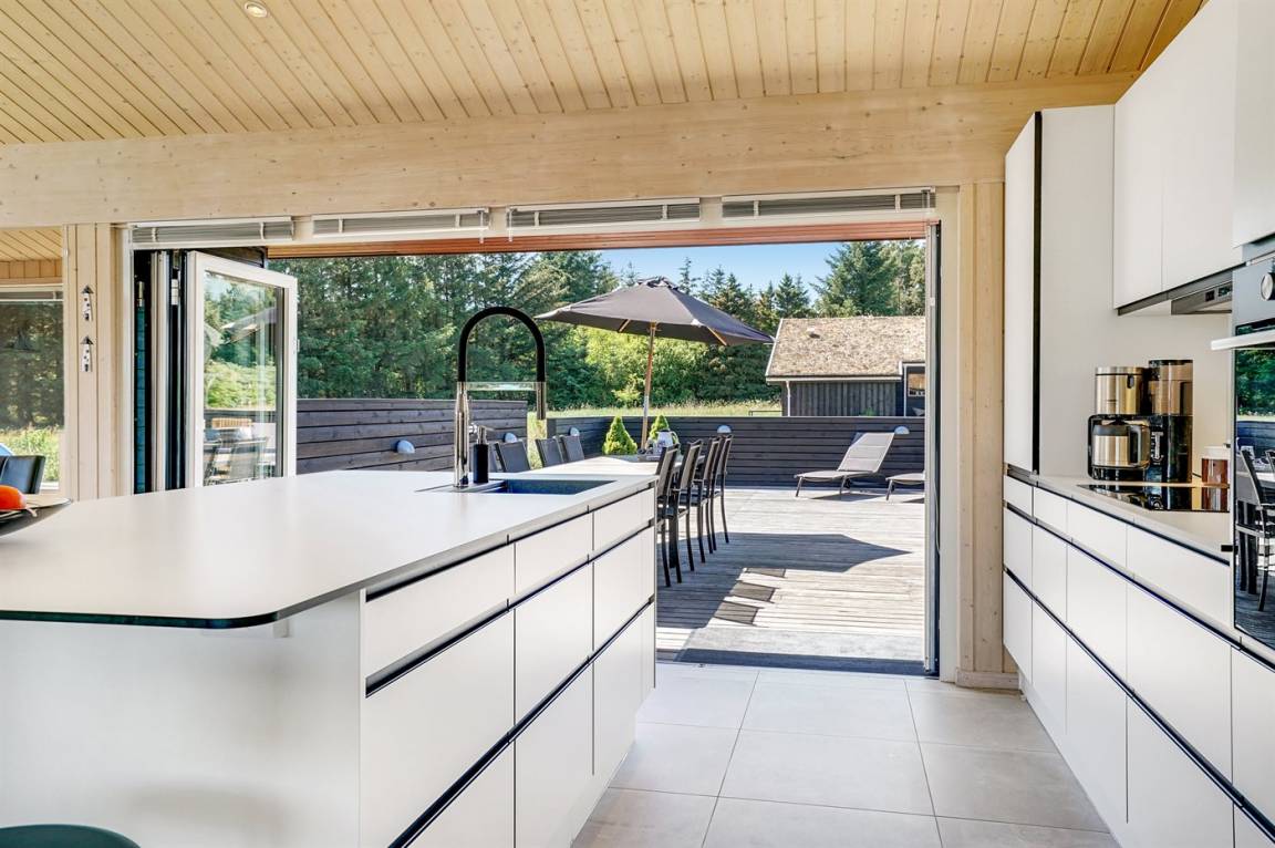 Großes, luxuriös ausgestattetes Ferienhaus aus Holz von 2009 mit Whirlpool und Sauna. Das Haus ist auf einem Naturgrundstück gebaut und von einem sehr großen und zum Teil überdachten Terrassenareal umgeben. Innen gibt es Klinkerböden, jedoch Holzböden in 2 Schlafzimmern. Geräumiges Badezimmer mit 2-Pers. Whirlpool, Sauna, Fußbodenheizung, Duschnische und Handtuchtrockner. Die herrliche Küche ist mit Geschirrspüler, Mikrowelle, Umluftofen, Tiefkühlgerät und Herd mit Ceran-Feld ausgestattet. Eine große Schiebetür vom Essplatz in der Küche und zur überdachten Terrasse macht es möglich, die Natur ins Haus zu lassen. Das luxuriös ausgestattete Wohnzimmer enthält Kaminofen, TV mit digitalem Satellitenanschluss und DVD-Spieler. Das Haus hat 2 Schlafzimmer mit Doppelbett und praktischem begehbarem Kleiderschrank sowie 1 Schlafzimmer mit 2 Einzelbetten. Darüber hinaus gibt es im Gästehaus 1 Schlafzimmer mit 2 Einzelbetten, TV und Playstation1 sowie Badezimmer mit Duschnische. Neben dem Gästehaus finden Sie einen Aktivitätsraum, der mit komb. Tischfußball/Tischtennis/Airhockey, Trimmrad, Rudermaschine und Musikanlage ausgestattet ist. Zur Ausstattung des Hauses gehören auch Kinderbett, Kinderhochstuhl, Waschmaschine und Wäschetrockner. Ein schönes Ferienhaus dicht an der Nordsee, am Vergnügungspark Fårup Sommerland und Waldgebiet gelegen.