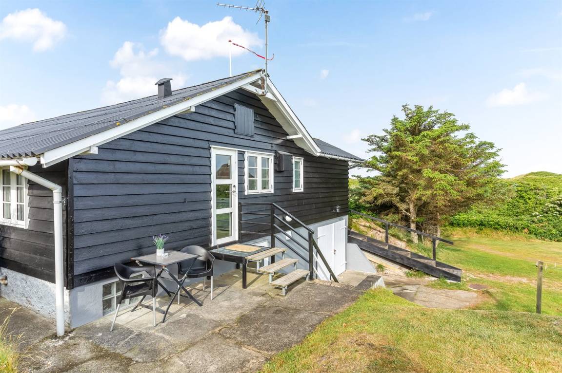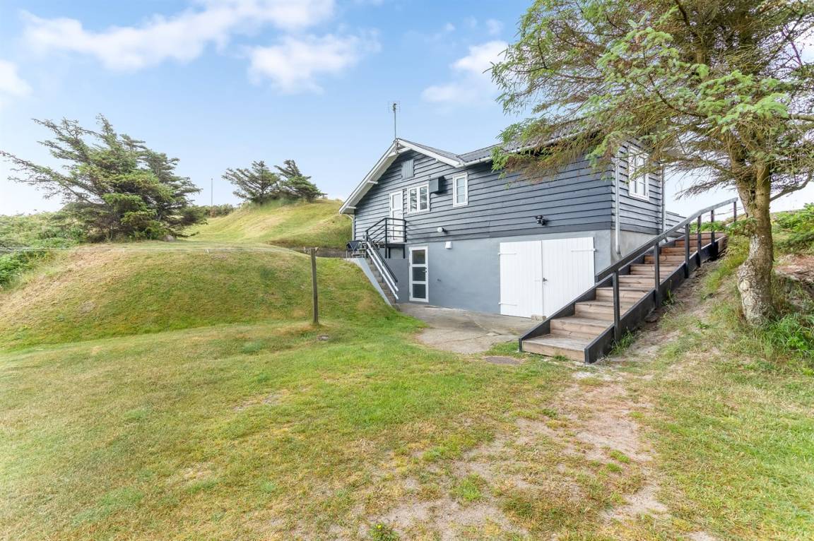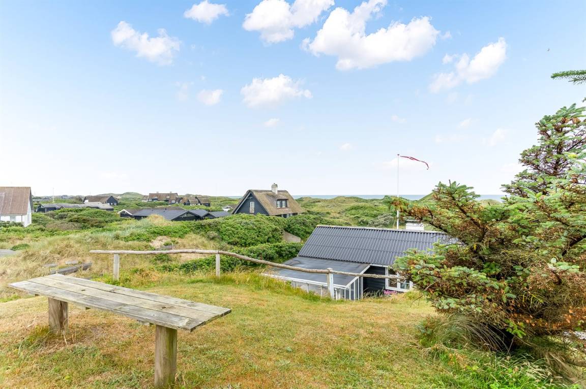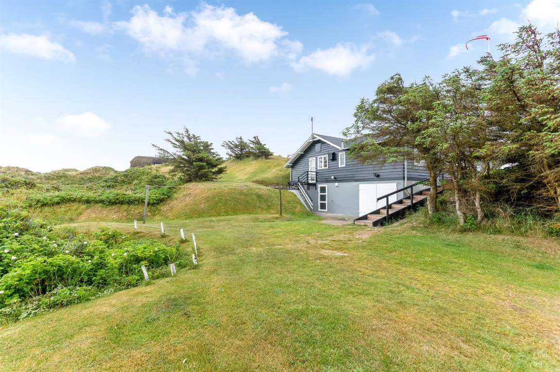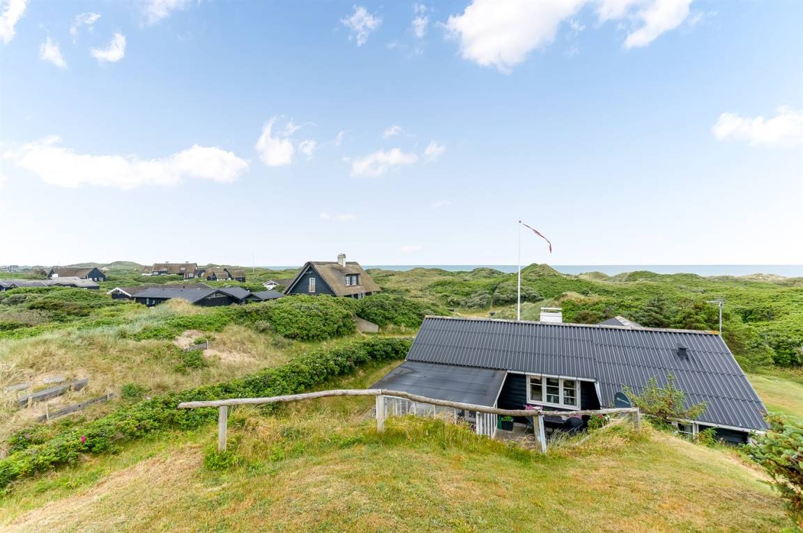 Dieses besonders idyllische und klassische Ferienhaus laufend in dem ursprünglichen Stil renoviert, liegt auf einem besonders großen und schönen, hügeligen und mit Hagebutten bewachsenen Natur-/Dünengrundstück in der 1. Dünenreihe, nur 140 m vom Wasser entfernt. Das Haus hat eigenes Grundstück zum Strand, der in wenigen Minuten zu Fuß auf einen öffentlichen Pfad erreicht werden kann. Vom höchsten Punkt des Grundstücks unmittelbar hinter dem Haus gibt es eine hervorragende Aussicht über das hübsche Gebiet, die Dünen und die Nordsee.