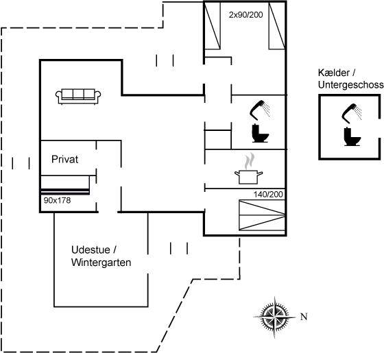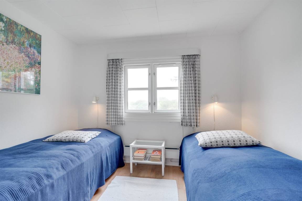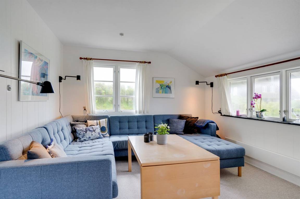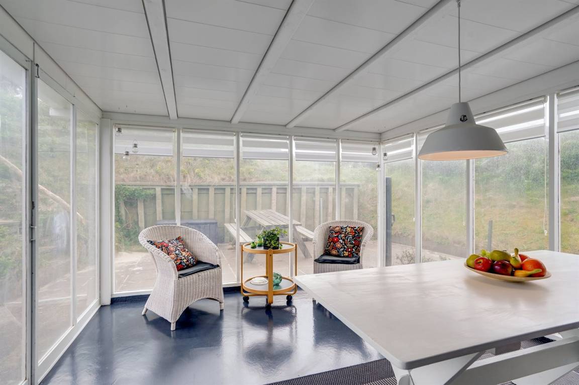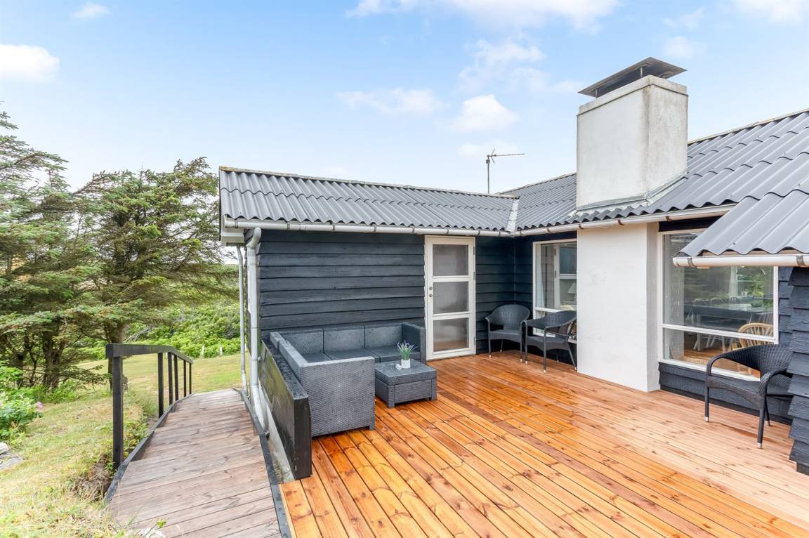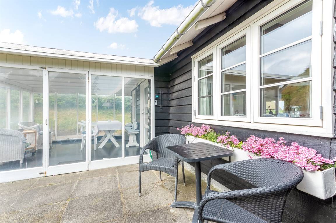 Nach Osten gibt es eine schöne, überdachte Glasterrasse und eine schöne ungestörte Terrasse mit Morgen- und Nachmittagssonne sowie eine schöne Terrasse nach Westen mit Gartenmöbeln. Ein sehr entzückendes Ferienhaus, wo Sie die klassische Ferienhausstimmung erleben können. An der nördlichen Seite des Hauses gibt es ein kleines Areal mit Gras mit Platz für Ballspiele. Treppen führen zum hoch gelegenen Haus hinauf, und es ist daher nicht für Gehbehinderte geeignet.