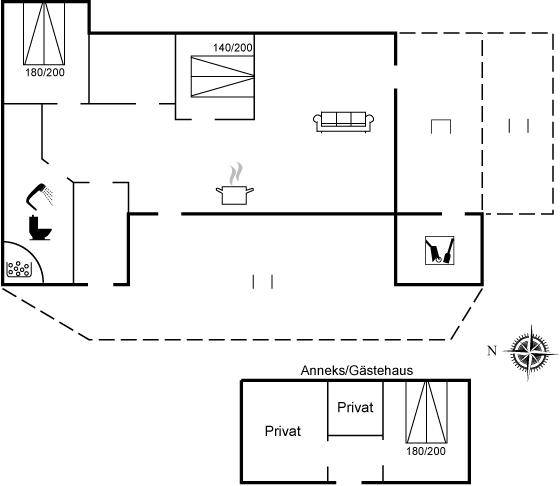 SchlafverhältnisseDie Schlafplätze verteilen sich auf 3 Schlafräume. 6 Schlafplätze in Doppelbetten. 2 von diesen Schlafplätzen befinden sich im Gästehaus. Ferner steht ein Kinderbett zur Verfügung.