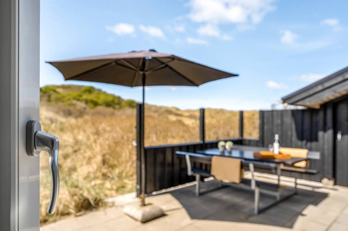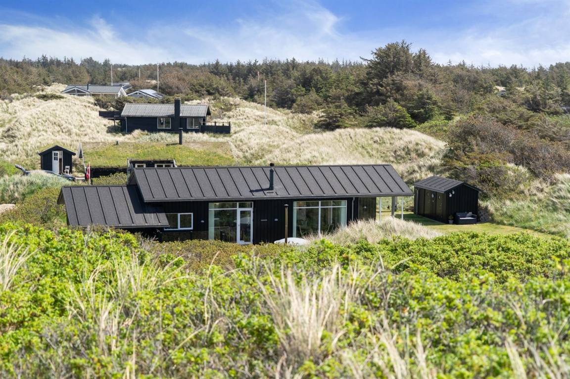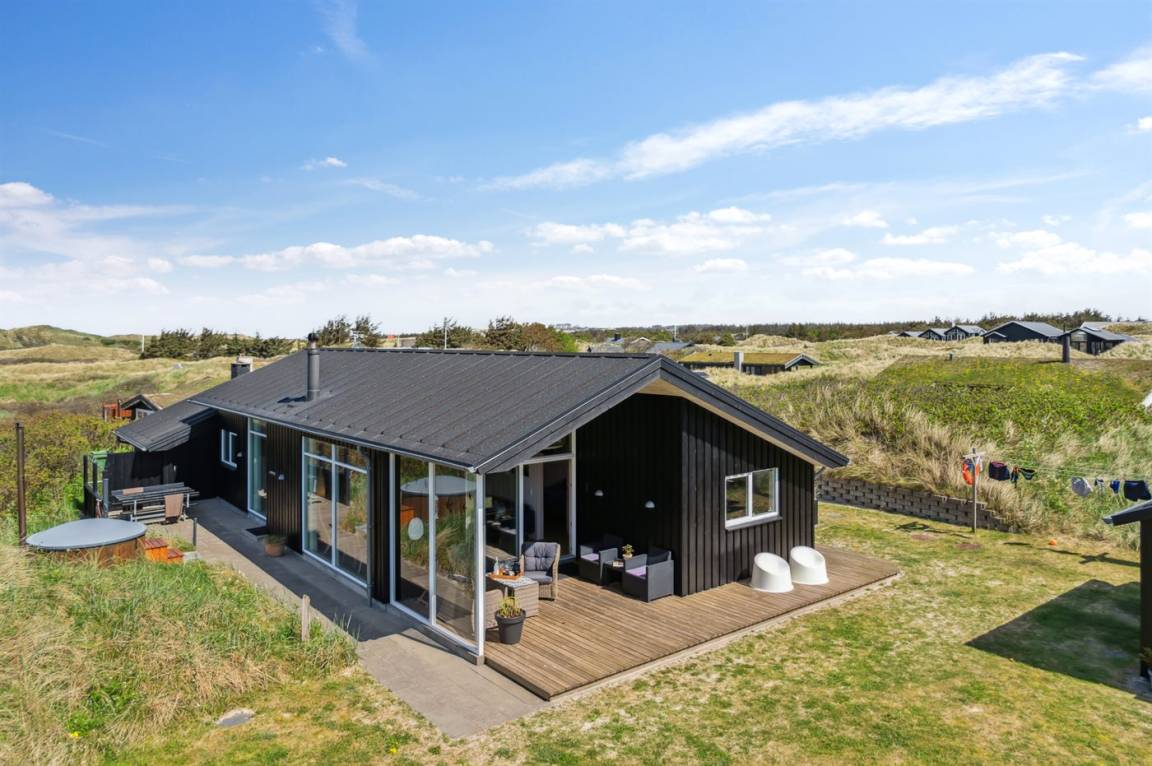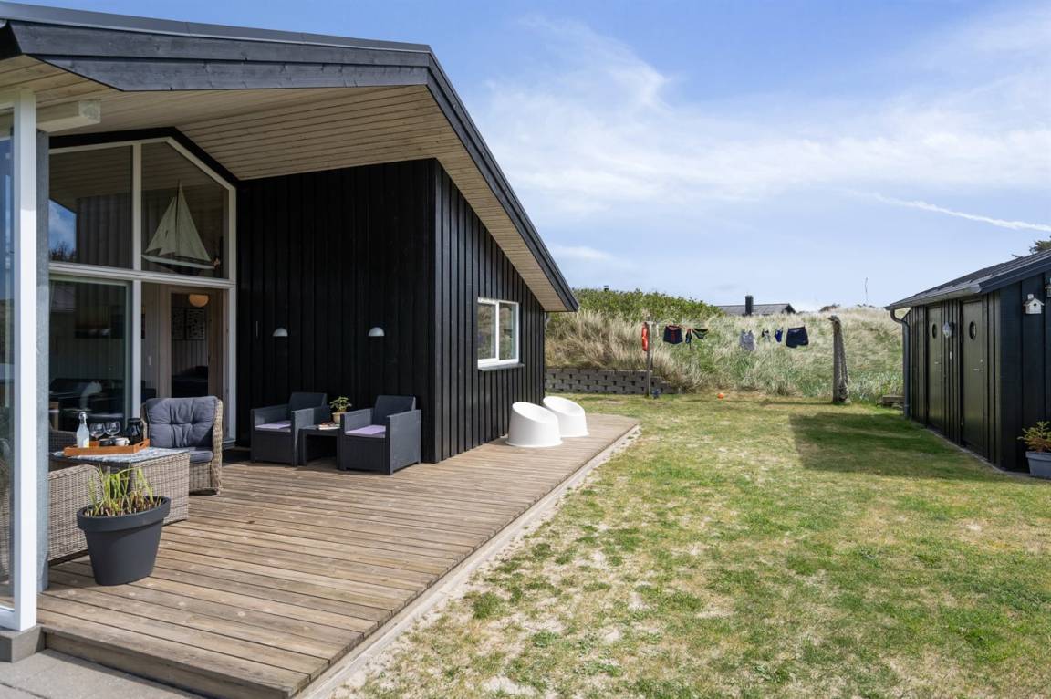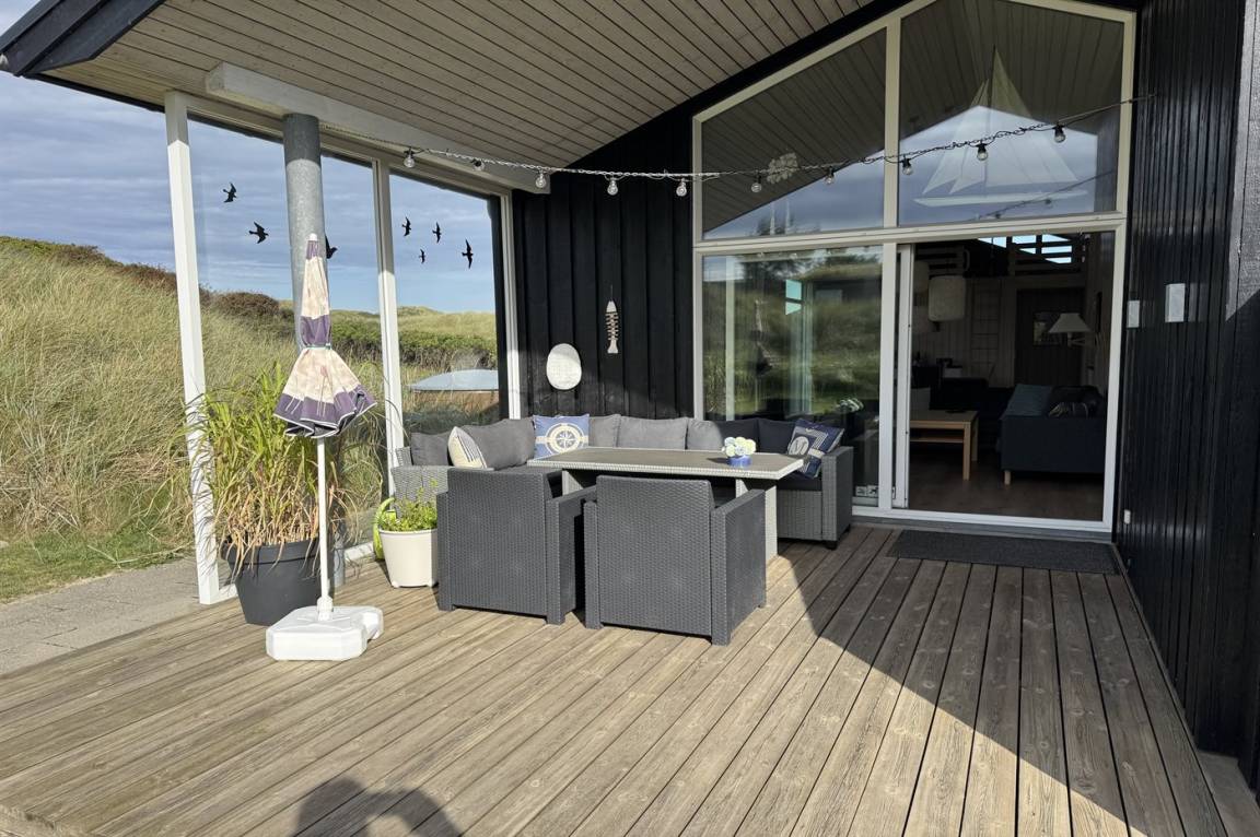 DraußenDie Ferienunterkunft liegt auf einem 3600 m² großen Dünengrundstück. Die Entfernung zum Meer beträgt 300 m. Die nächste Einkaufsmöglichkeit liegt 1500 m entfernt. Es steht ein 100 m² Terrassenareal zur Verfügung. Außerdem gibt es 12 m² überdachte Terrasse. Geräteraum. Außendusche. Es steht ein Grill zur Verfügung. Es steht ein Carport zur Verfügung. Parkplatz auf dem Grundstück.