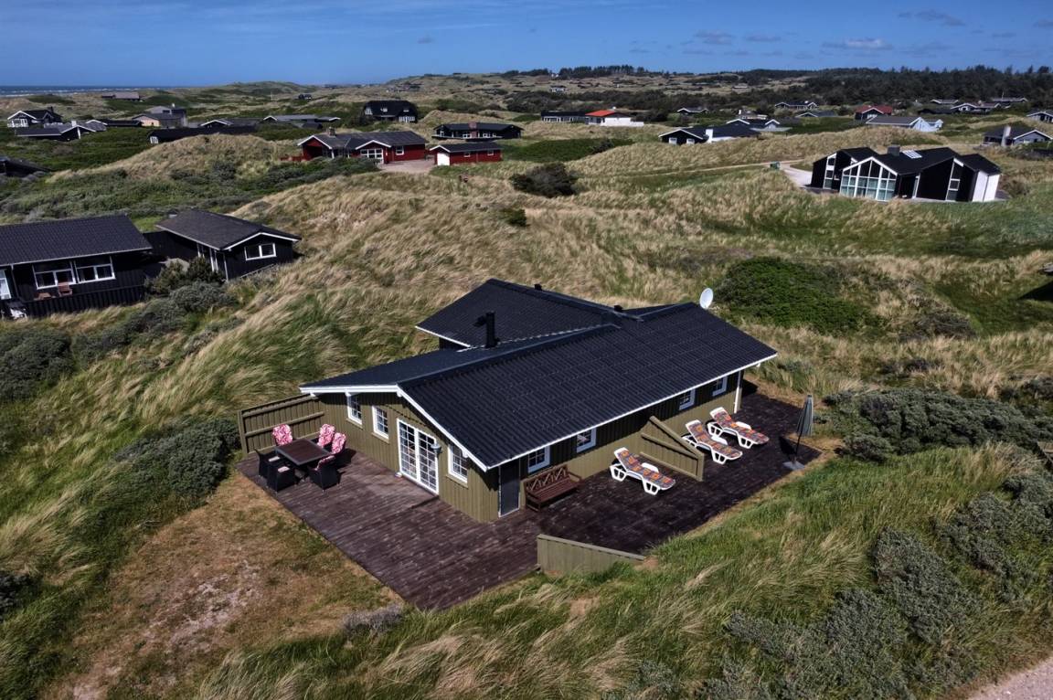 DraußenDie Ferienunterkunft liegt auf einem 1250 m² großen Dünengrundstück. Die Entfernung zum Meer beträgt 250 m. Die nächste Einkaufsmöglichkeit liegt 3000 m entfernt. Es steht ein 60 m² Terrassenareal zur Verfügung. Geräteraum. Parkplatz auf dem Grundstück.