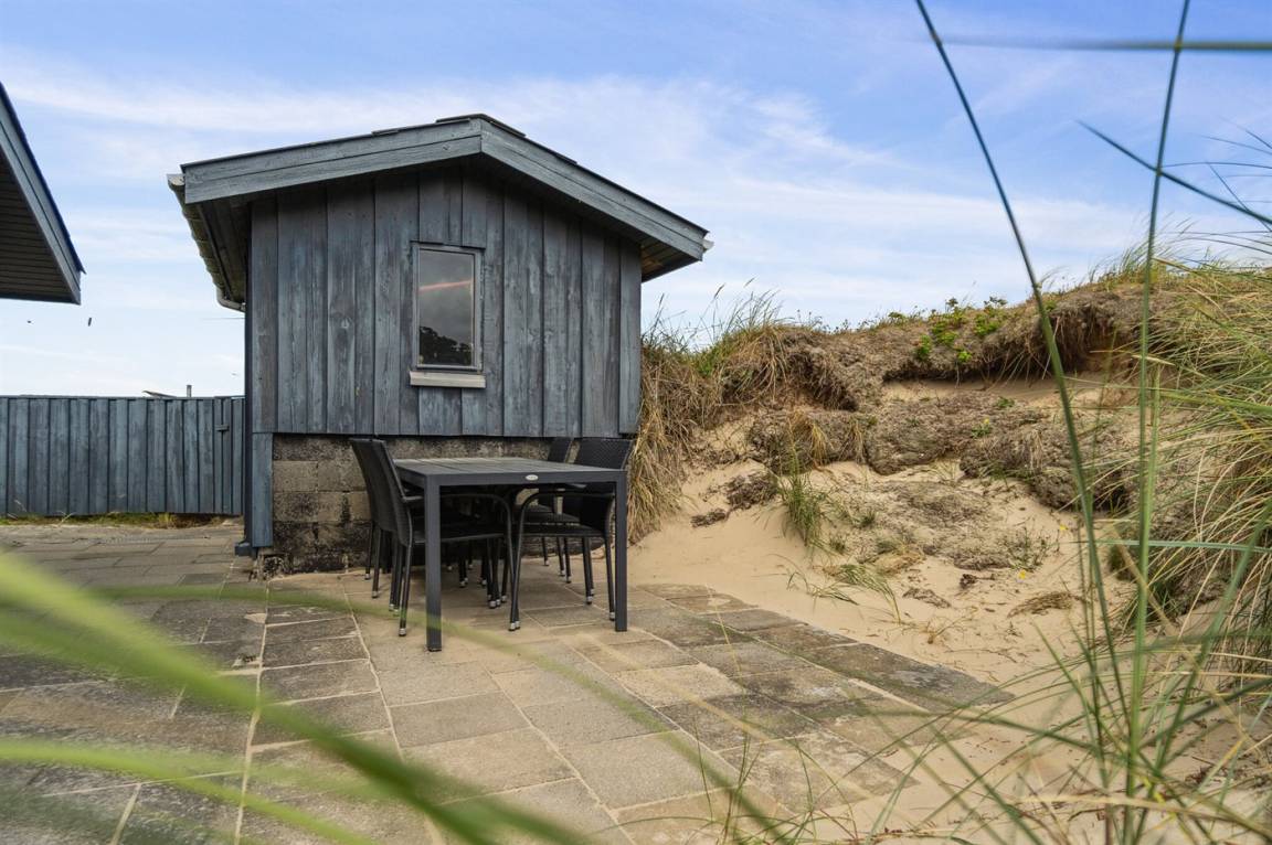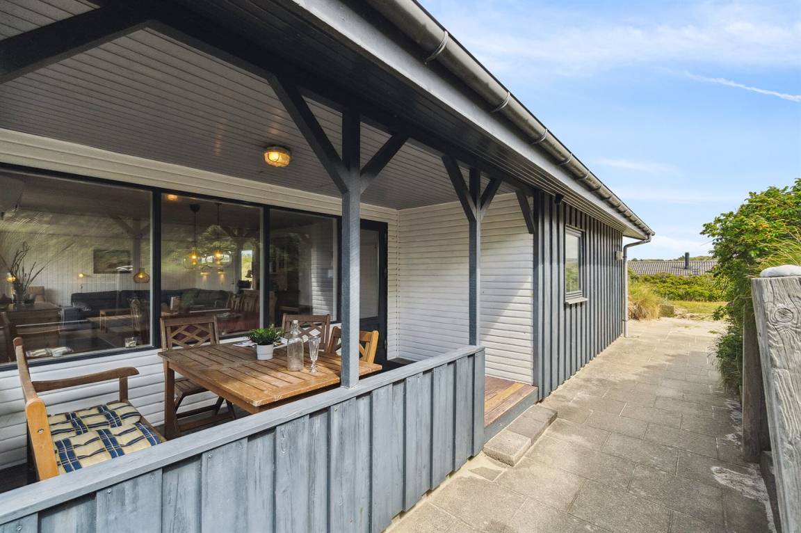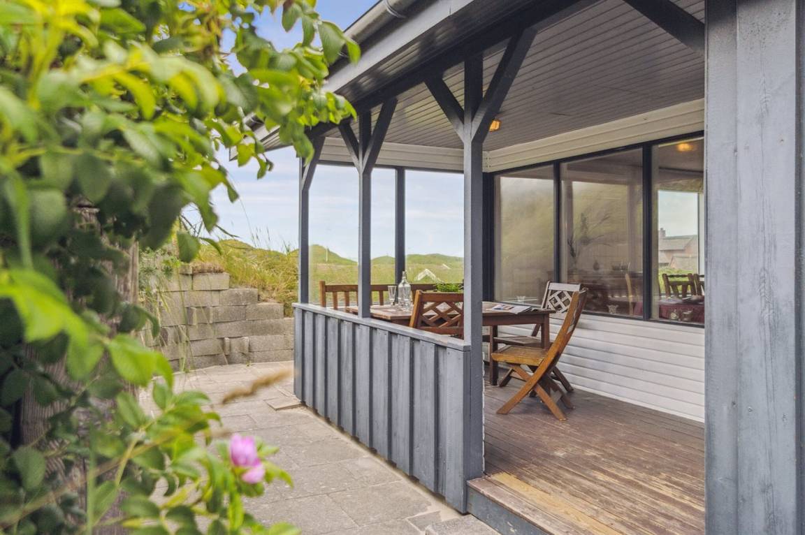 DraußenDie Ferienunterkunft liegt auf einem 1800 m² großen Dünengrundstück. Die Entfernung zum Meer beträgt 250 m. Die nächste Einkaufsmöglichkeit liegt 3000 m entfernt. Es steht ein 20 m² Terrassenareal zur Verfügung. Außerdem gibt es 8 m² überdachte Terrasse. Geräteraum. Parkplatz auf dem Grundstück.