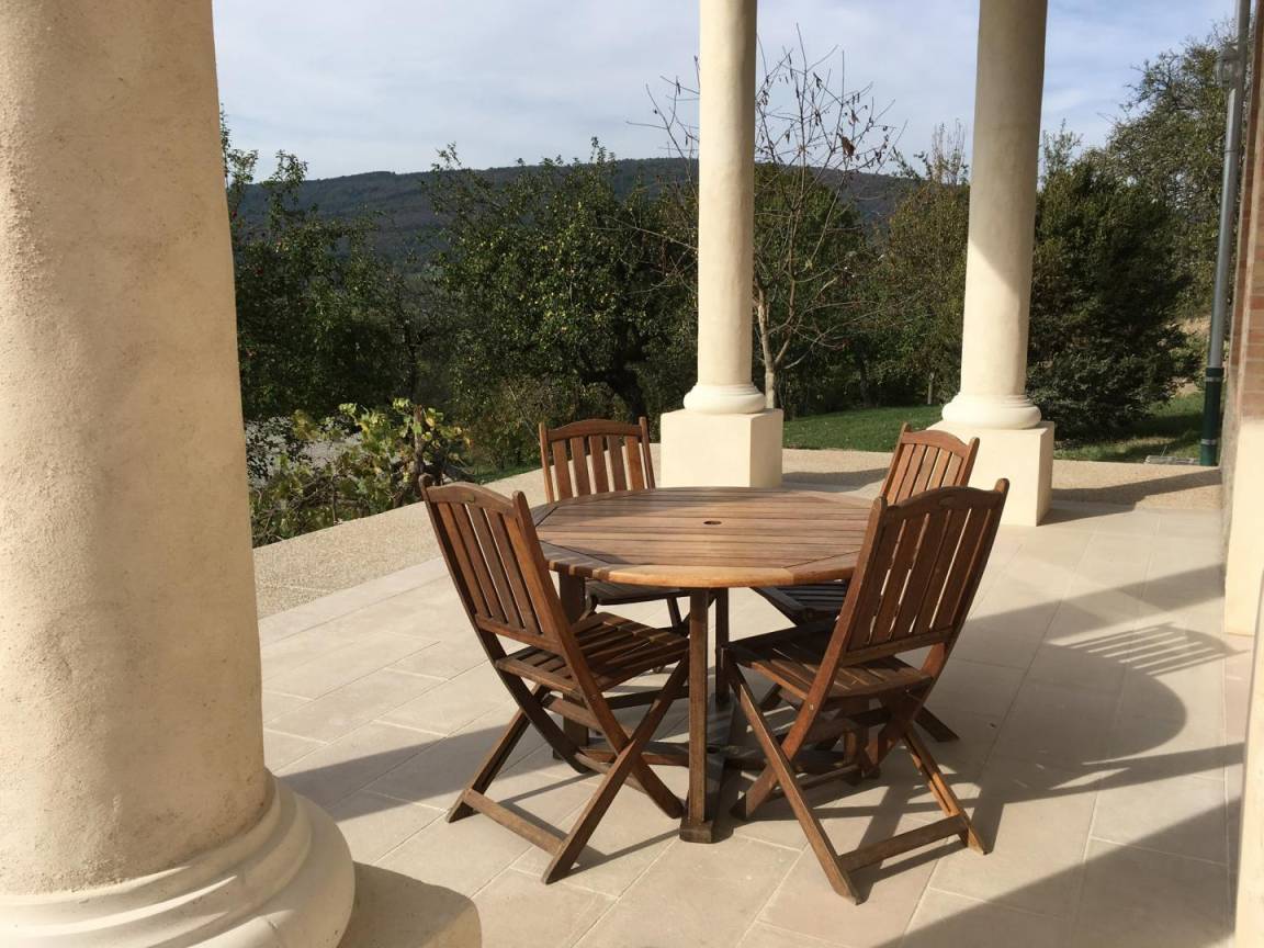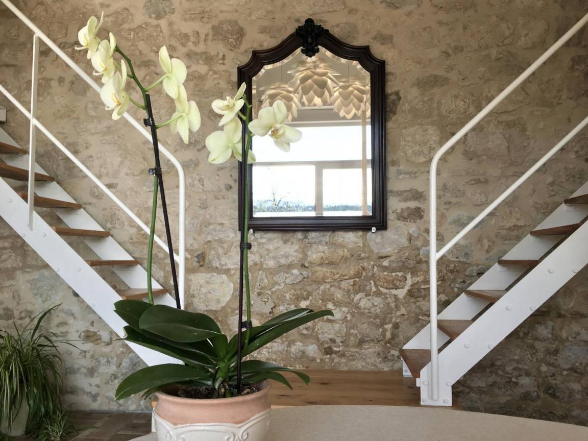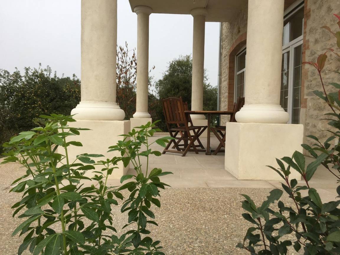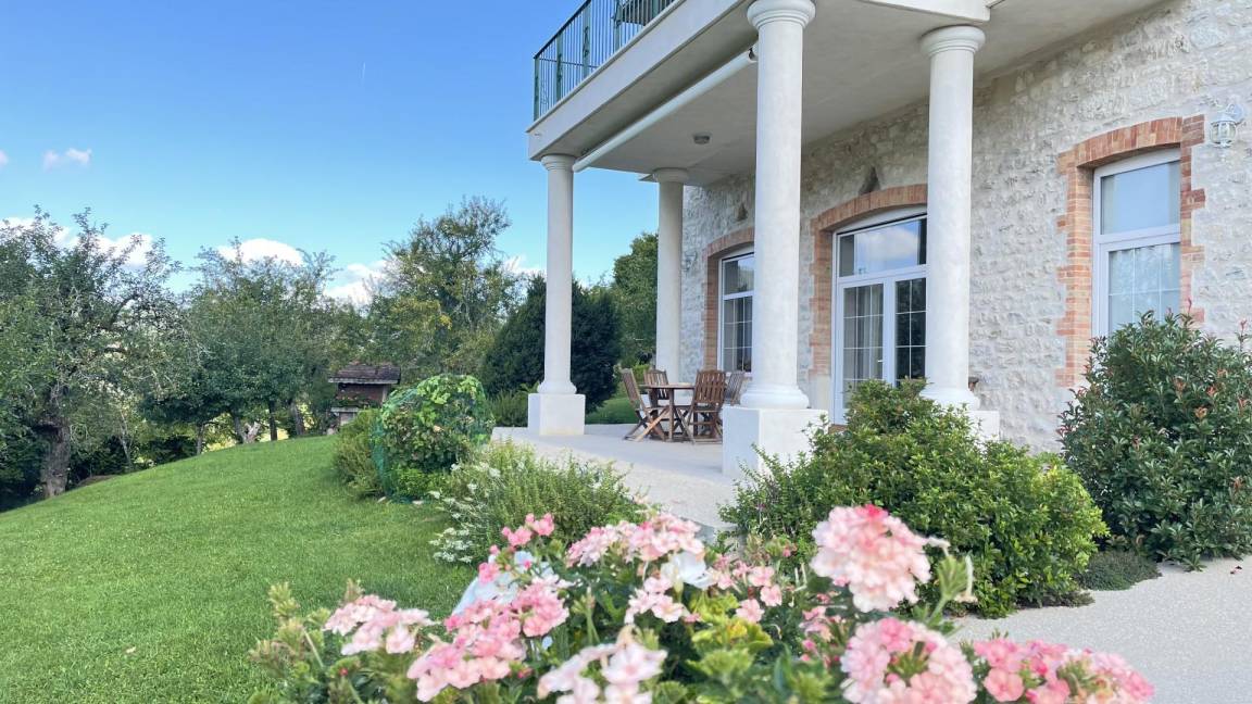 Der Eingang führt durch den privaten unteren Innenhof auf die 50 m² große überdachte Terrasse, wo vier große Säulen majestätisch vor einer prächtigen Natursteinfassade stehen.