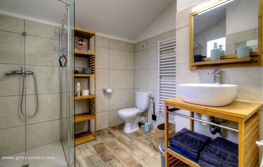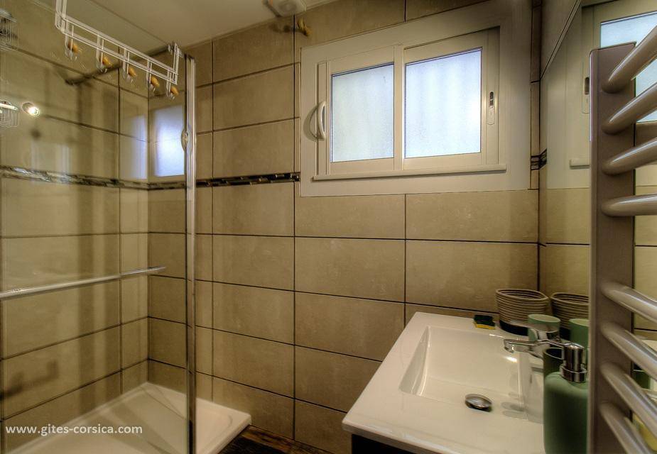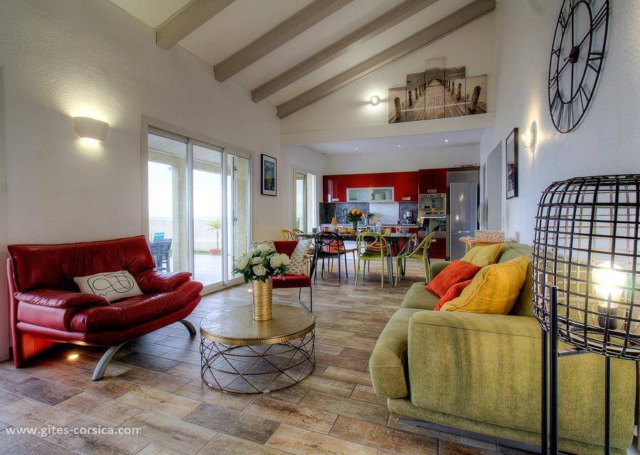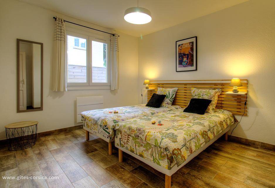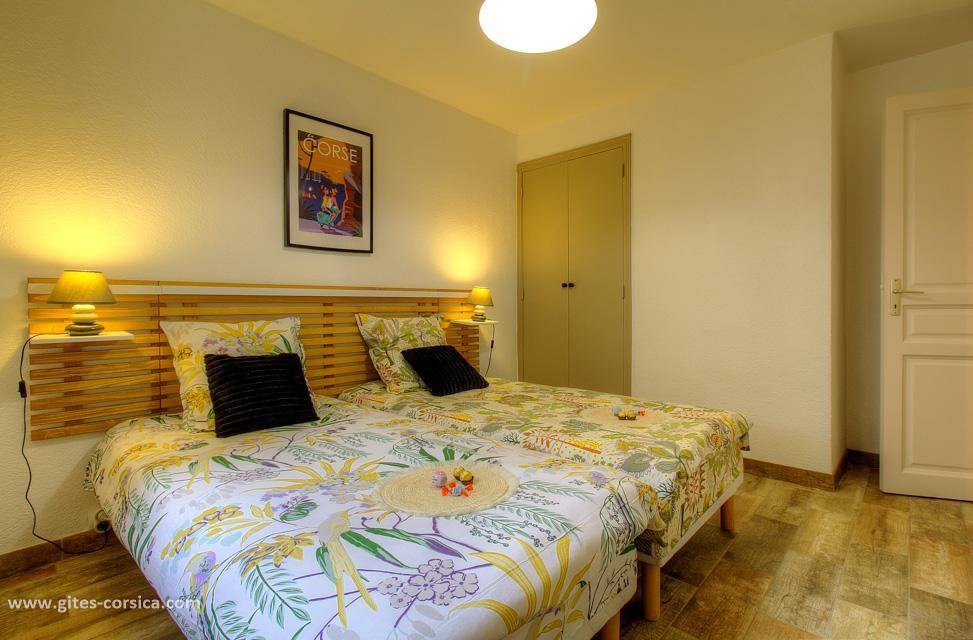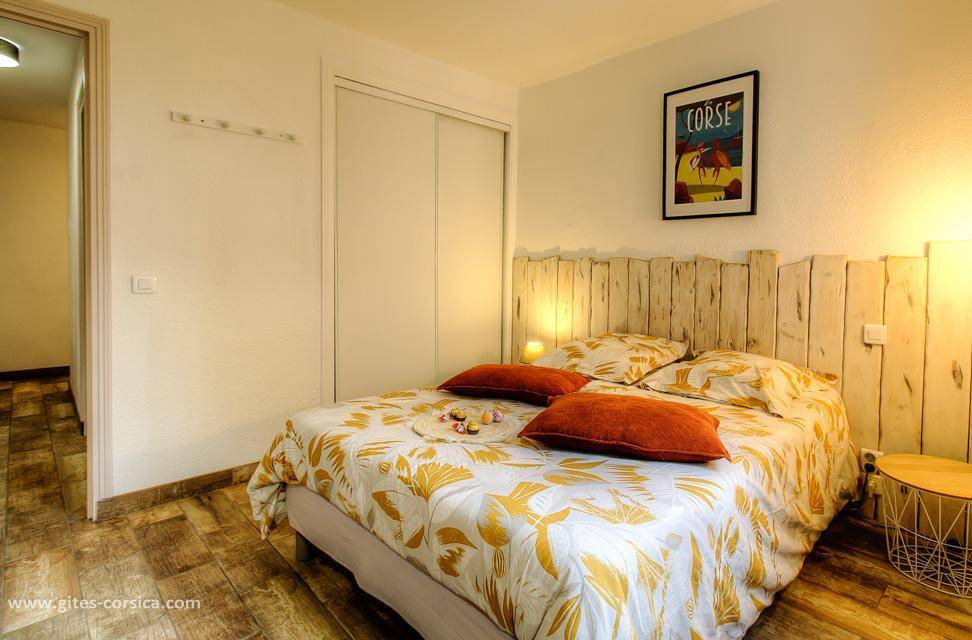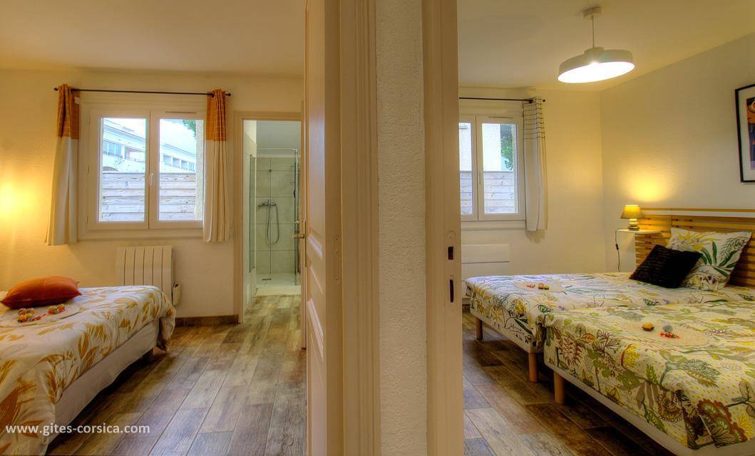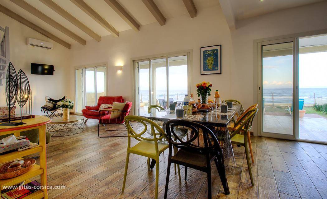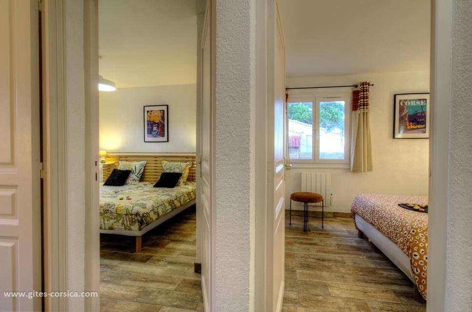 Am Strand von Moriani befindet sich ein 105 m² großes Haus auf zwei Ebenen, in der Nähe eines ganzjährig bewohnten Hauses (gemeinsamer Eingang und Parkplatz). Die Unterkunft gliedert sich wie folgt: