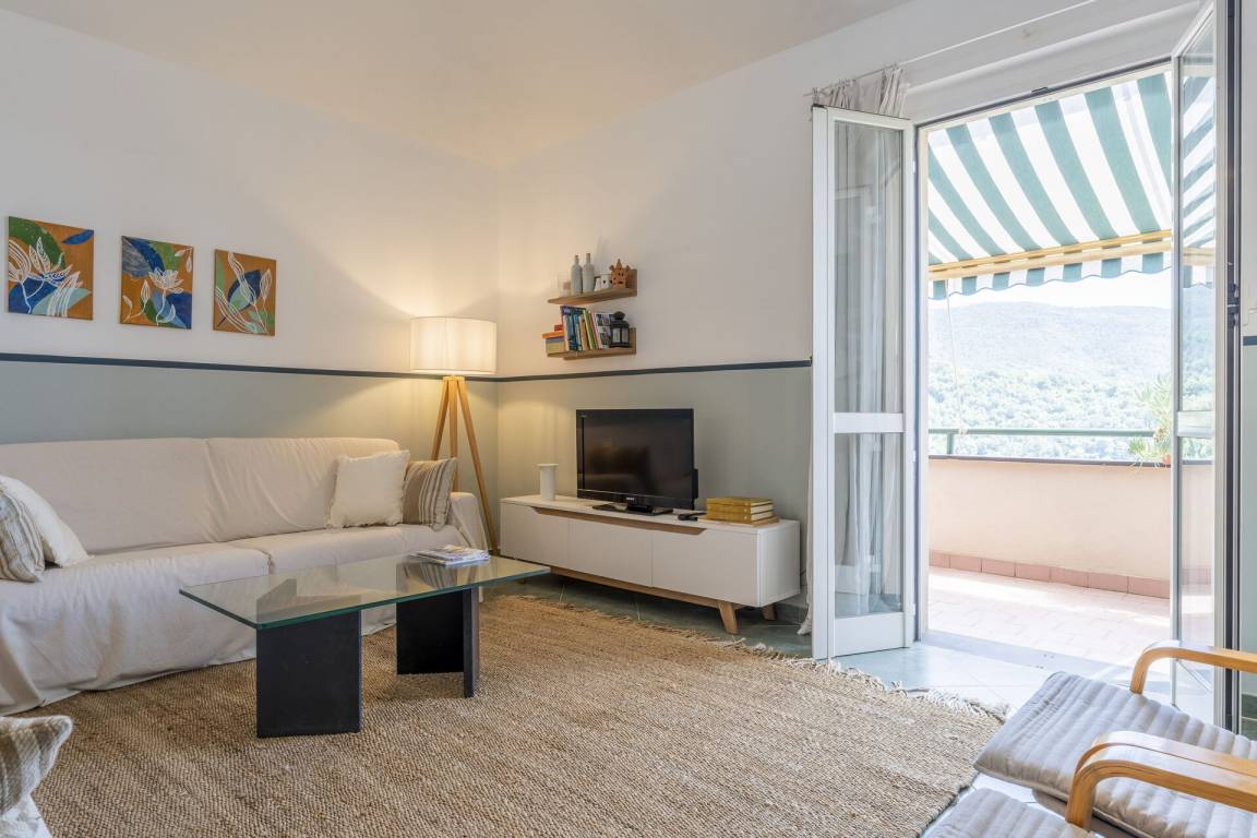 Wohnzimmer: Sofa, WiFi Internet, TV, Ausgang auf die Terrasse.