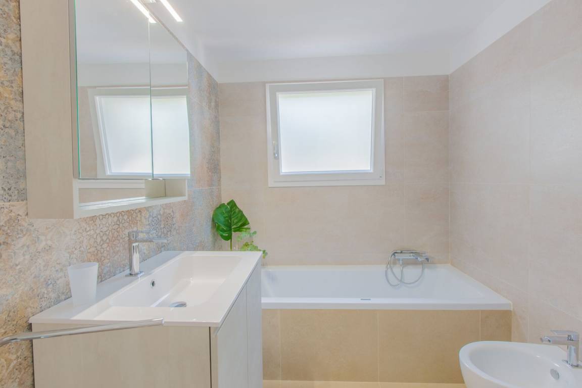 Badezimmer 2: Waschbecken, WC, Bidet, Badewanne, Fön.
