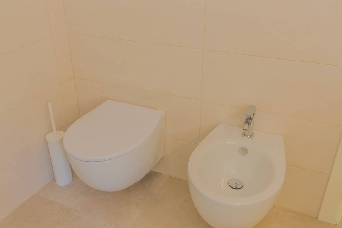 Badezimmer 1: Waschbecken, WC, Bidet, Dusche.