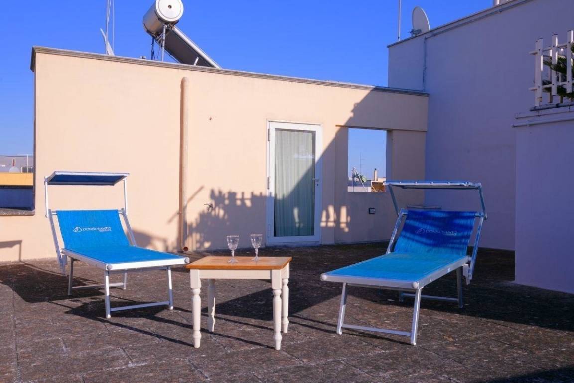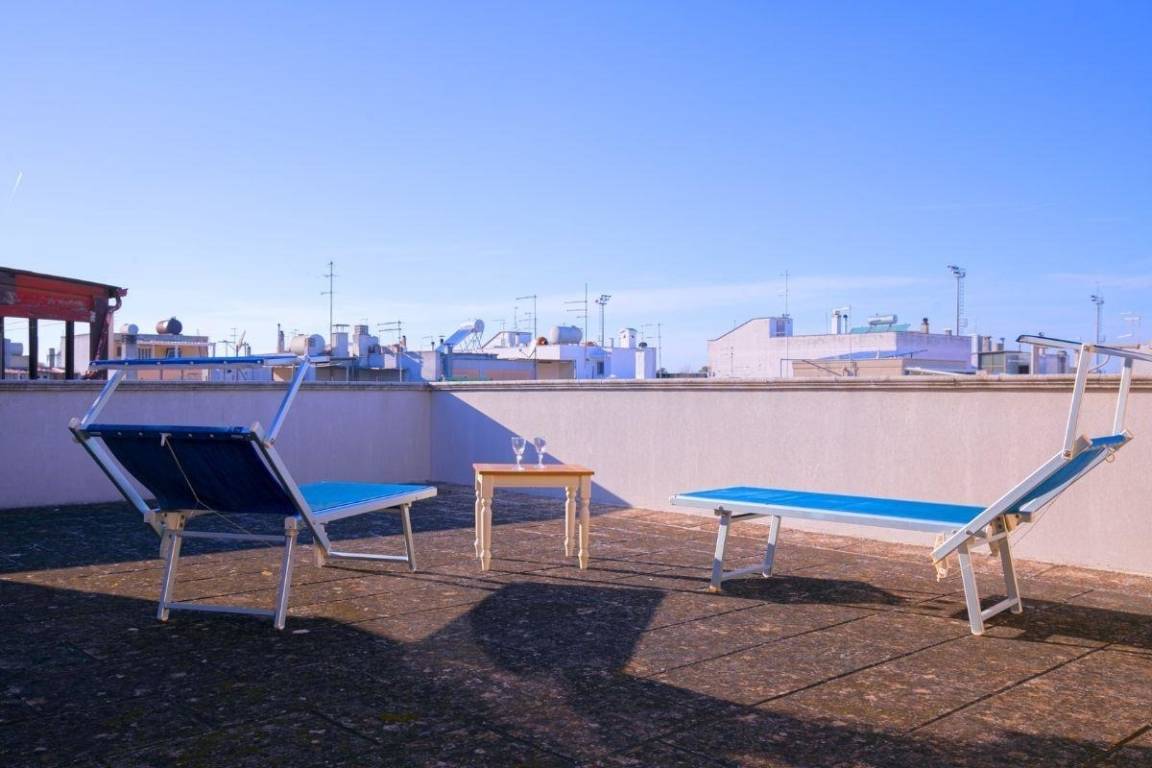 Im Außenbereich im zweiten Stock steht Ihnen eine große Terrasse zur Verfügung, auf der Sie sich auf unseren Liegestühlen sonnen können.