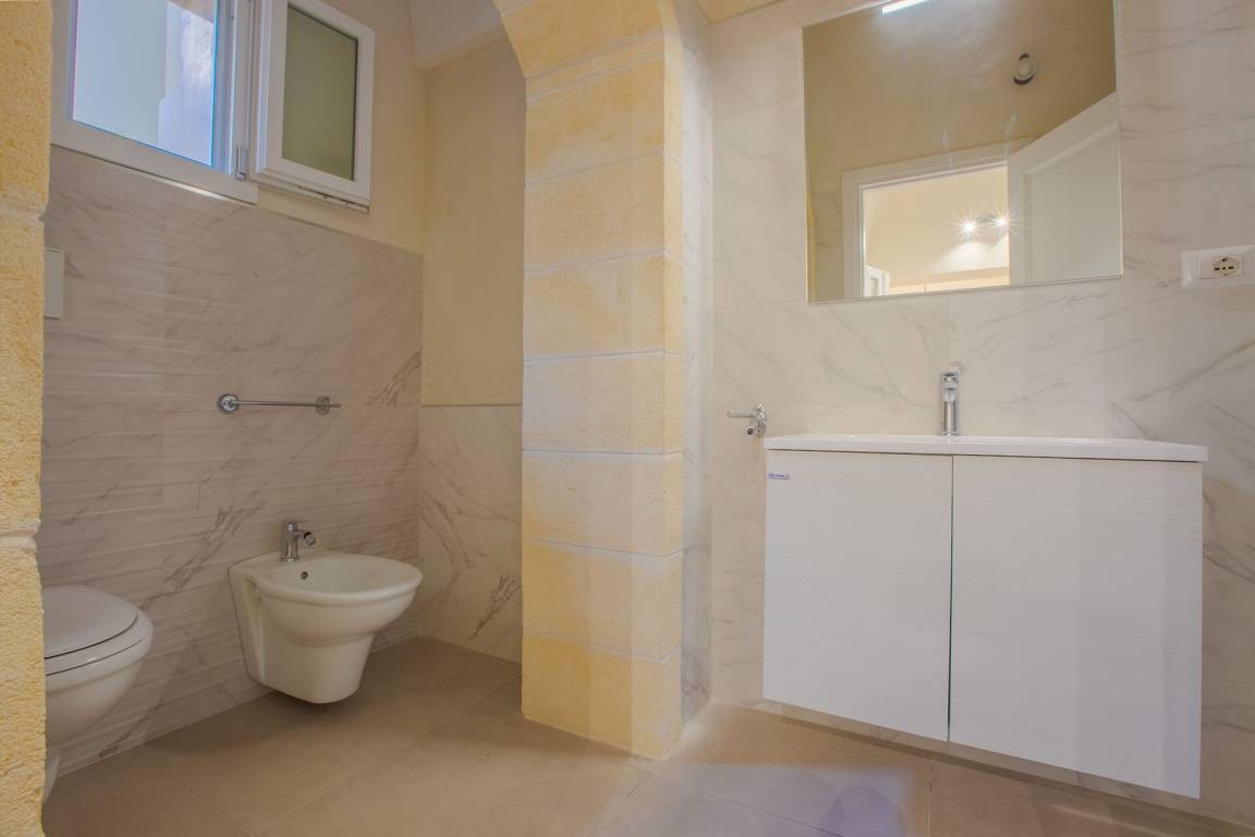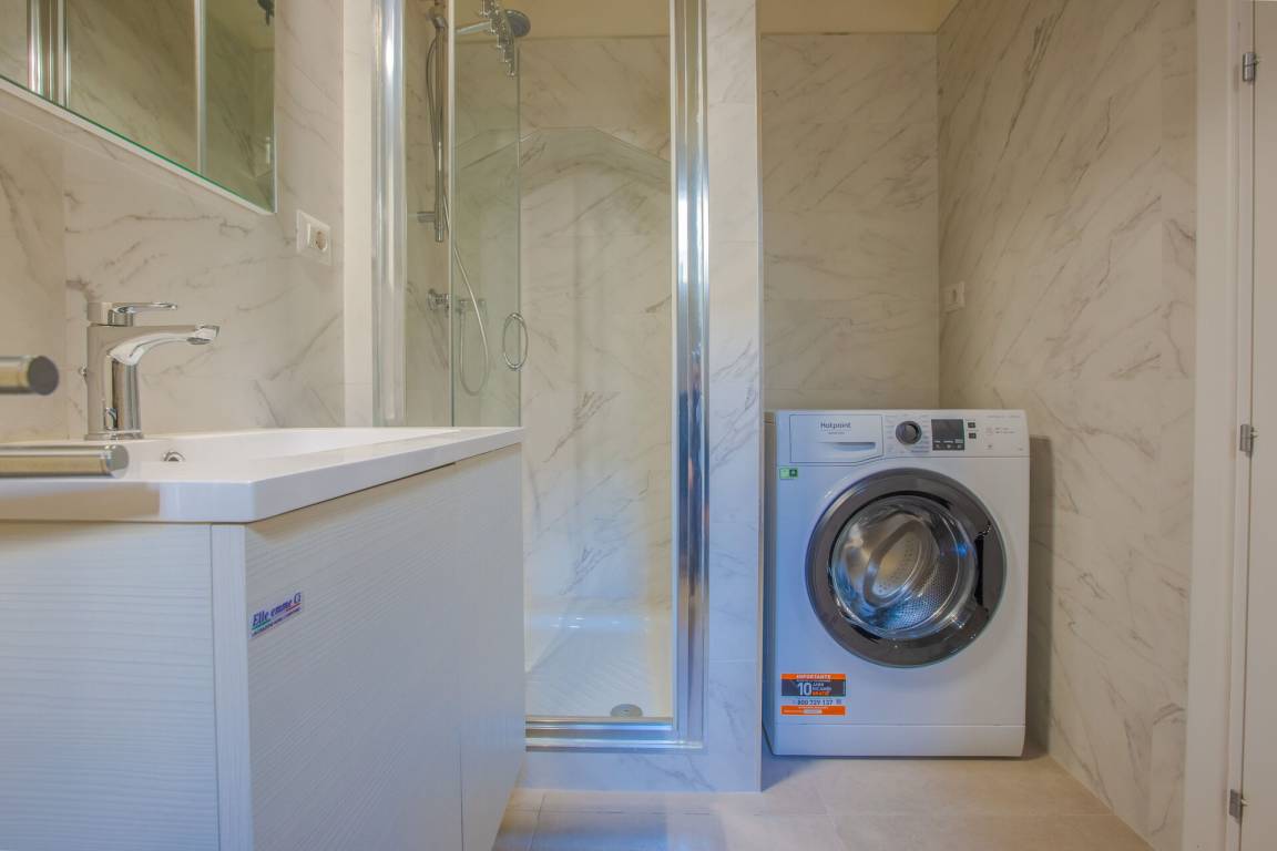 Badezimmer: Waschbecken, WC, Bidet, Dusche, Waschmaschine.