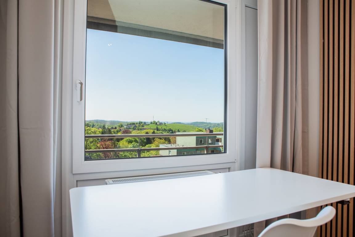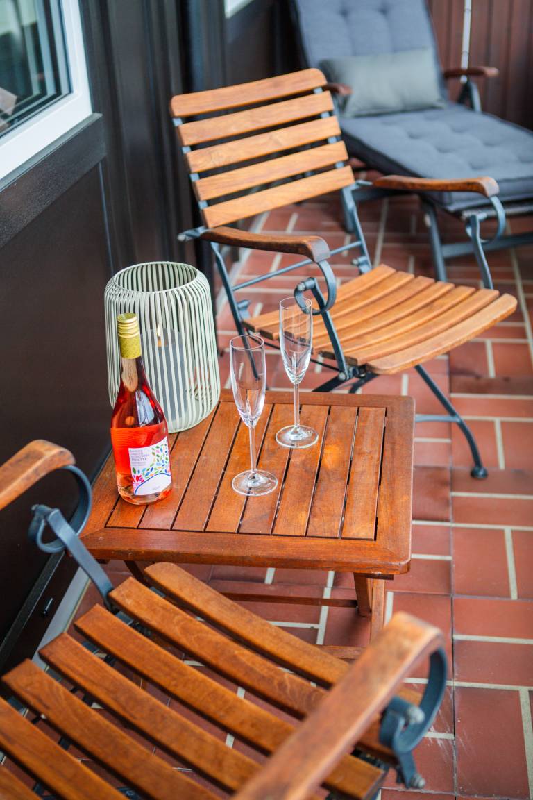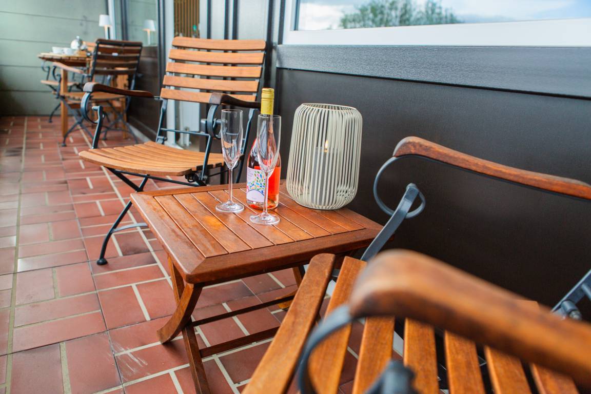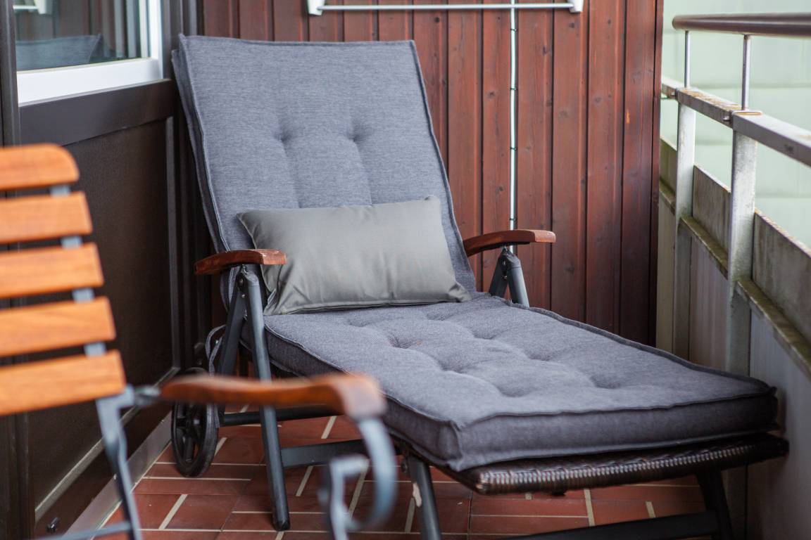 Genießen Sie entspannte Stunden auf dem großzügigen Balkon mit wunderschönem Blick ins Grüne – der ideale Ort zum relaxen auf der Sonnenliege oder ein Glas Wein am Abend.