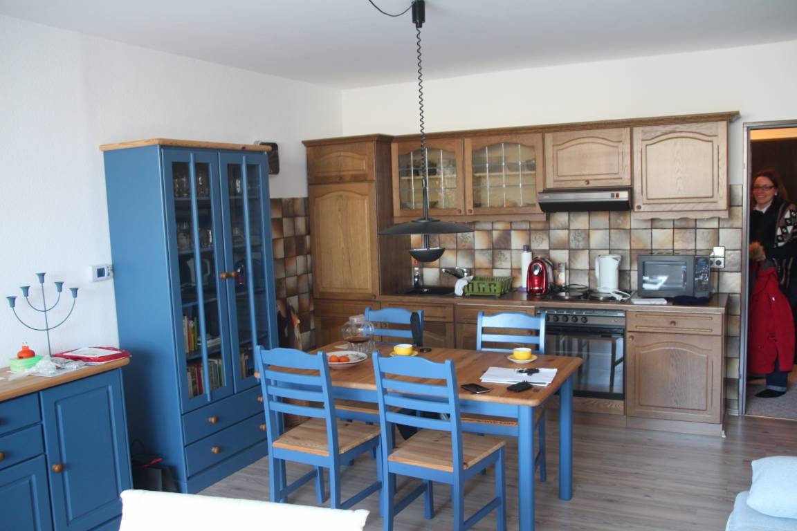 Es ist eine umfangreich ausgestattete Einbauküche vorhanden. Unter anderem gehören zum Inventar der Küche ein großer Kühlschrank mit Gefrierfach, ein Backofen, eine Mikrowelle, eine Kaffeemaschine ( für Senseo-Pads und Filtertüten), ein Wasserkocher, ein Eierkocher, ein Toaster, eine Kaffeeisolierkanne u.a.
