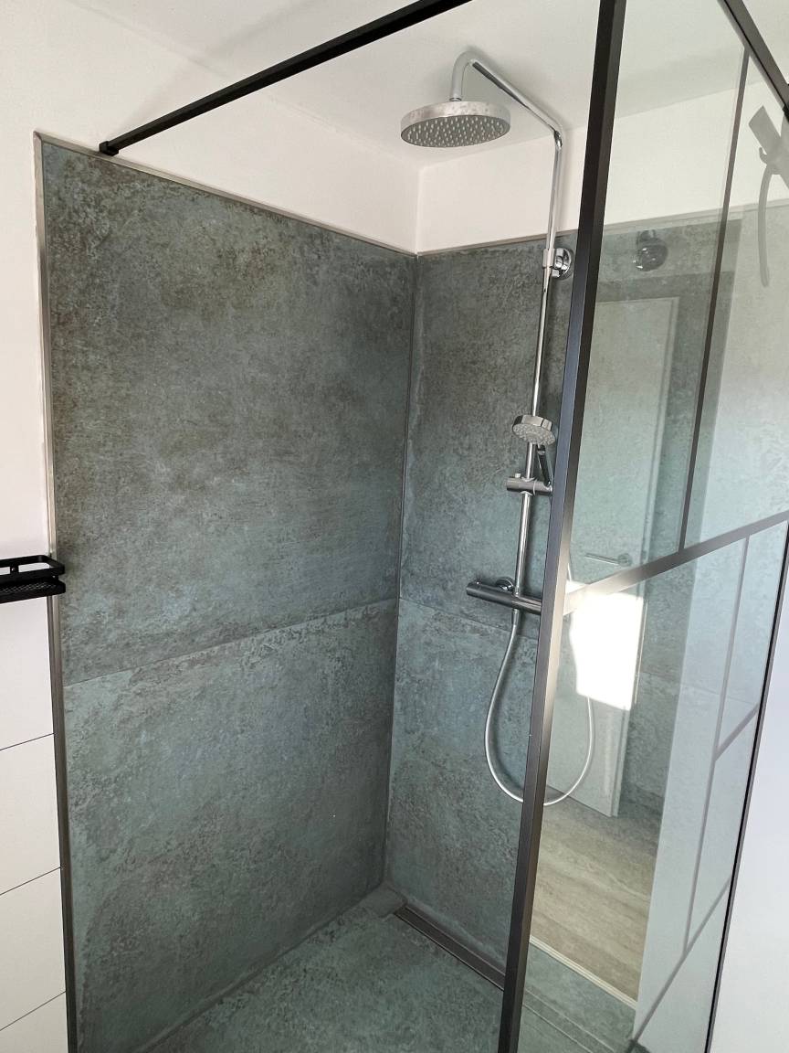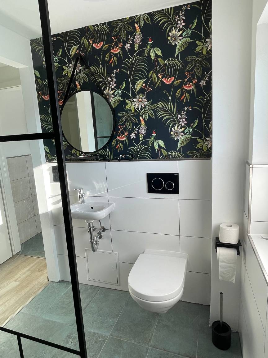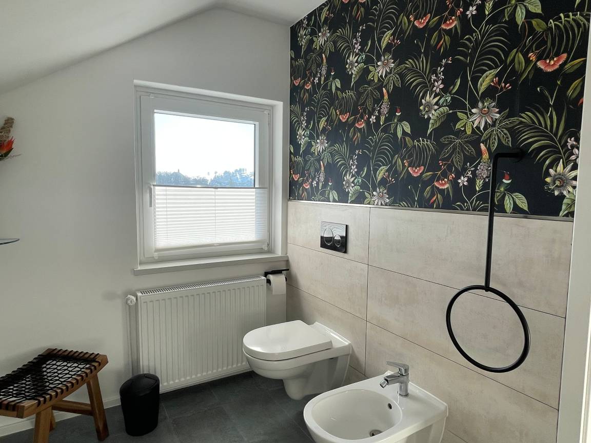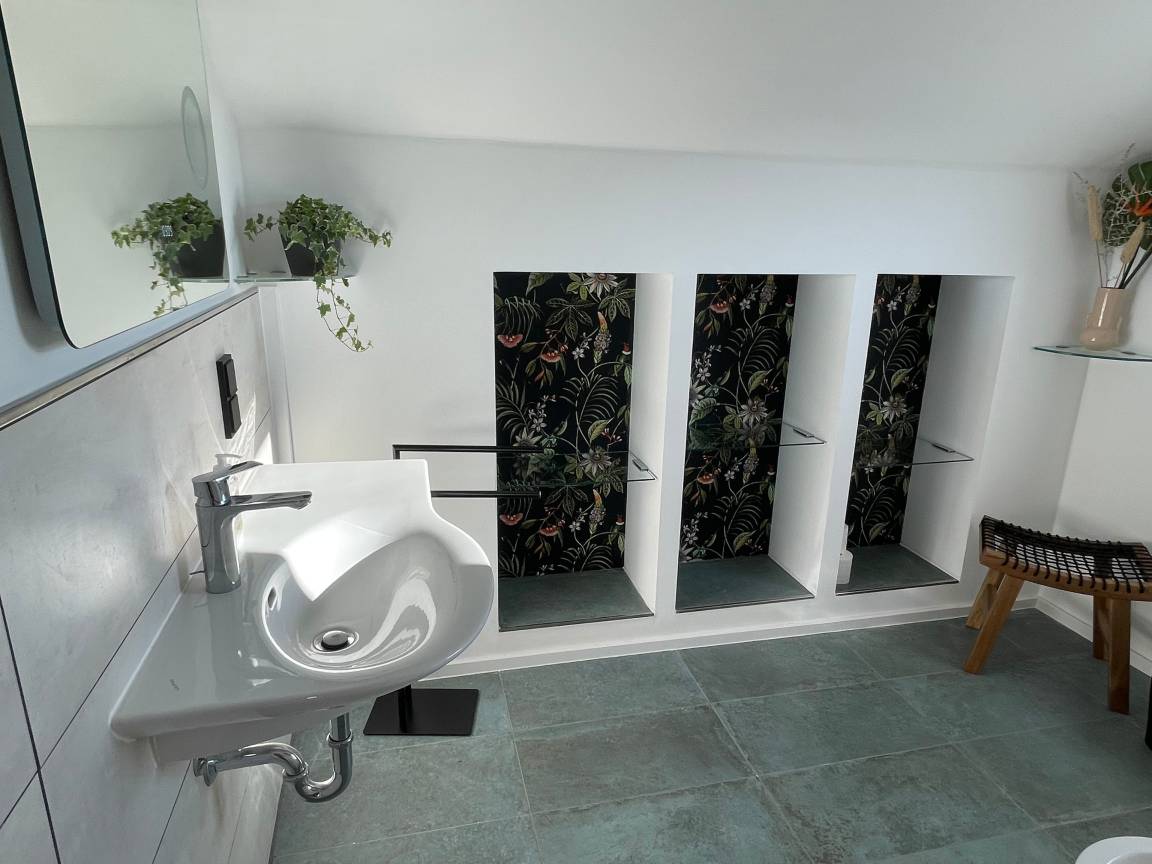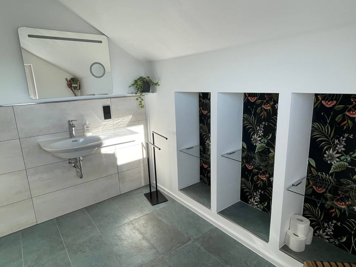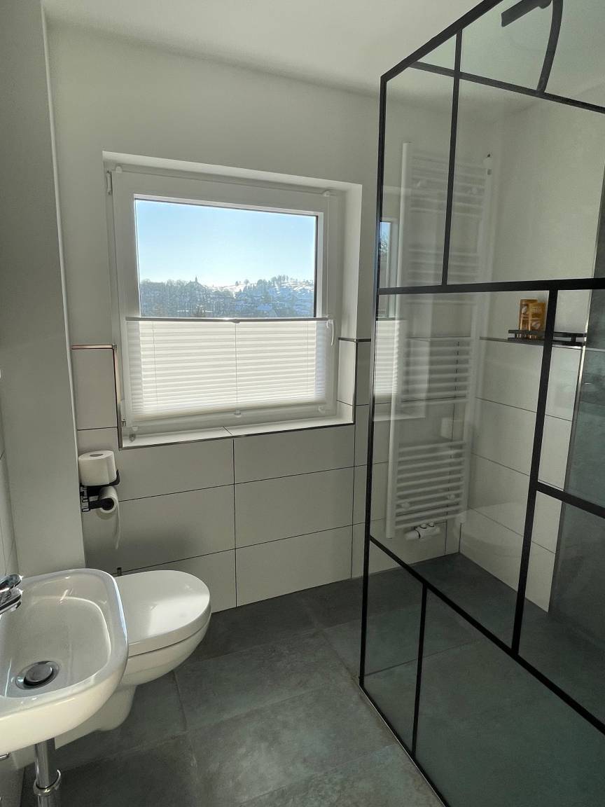 Außerdem verfügt die Ferienwohnung über ein großes modernes Duschbad mit Toilette, Waschbecken und ebenerdiger Dusche. Zusätzlich steht Ihnen eine separate Gästetoilette mit kleinem Waschbecken und Bidet zur Verfügung. Beide Bäder verfügen über Tageslicht.