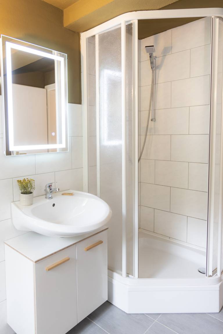 Das Badezimmer verfügt über ein Wc und eine Dusche.