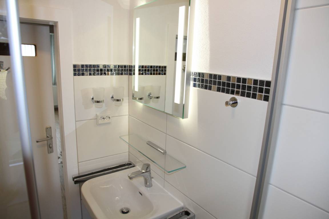 Im Bad, ausgestattet mit WC, Waschbecken und Dusche, stehen unseren Gästen auch ein Haartrockner, Handwaschseife und Kosmetiktücher zur Verfügung.