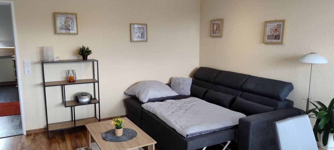 Wohnzimmer mit Schlafsofa für eine weitere Person