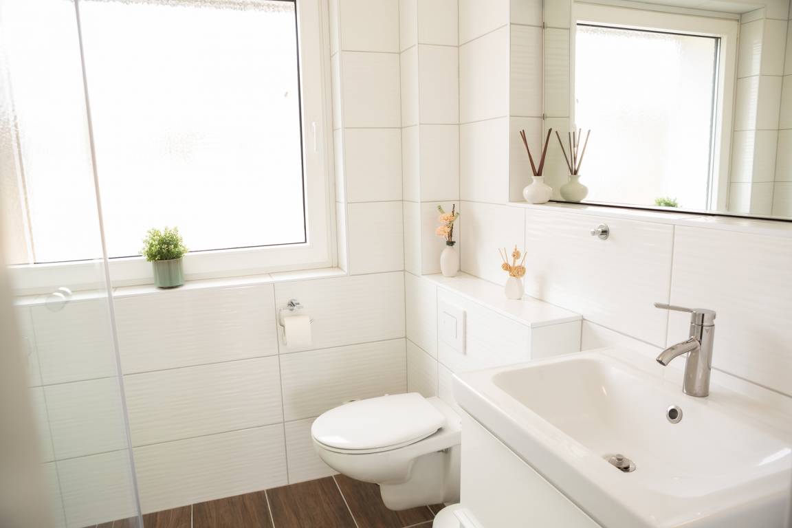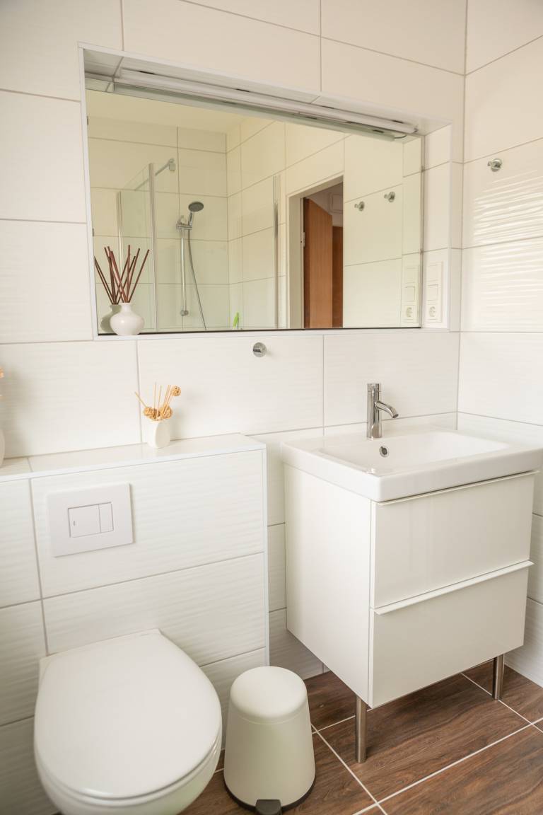 Das Badezimmer mit Fenster verfügt über Dusche, WC, Waschtisch und Spiegel.