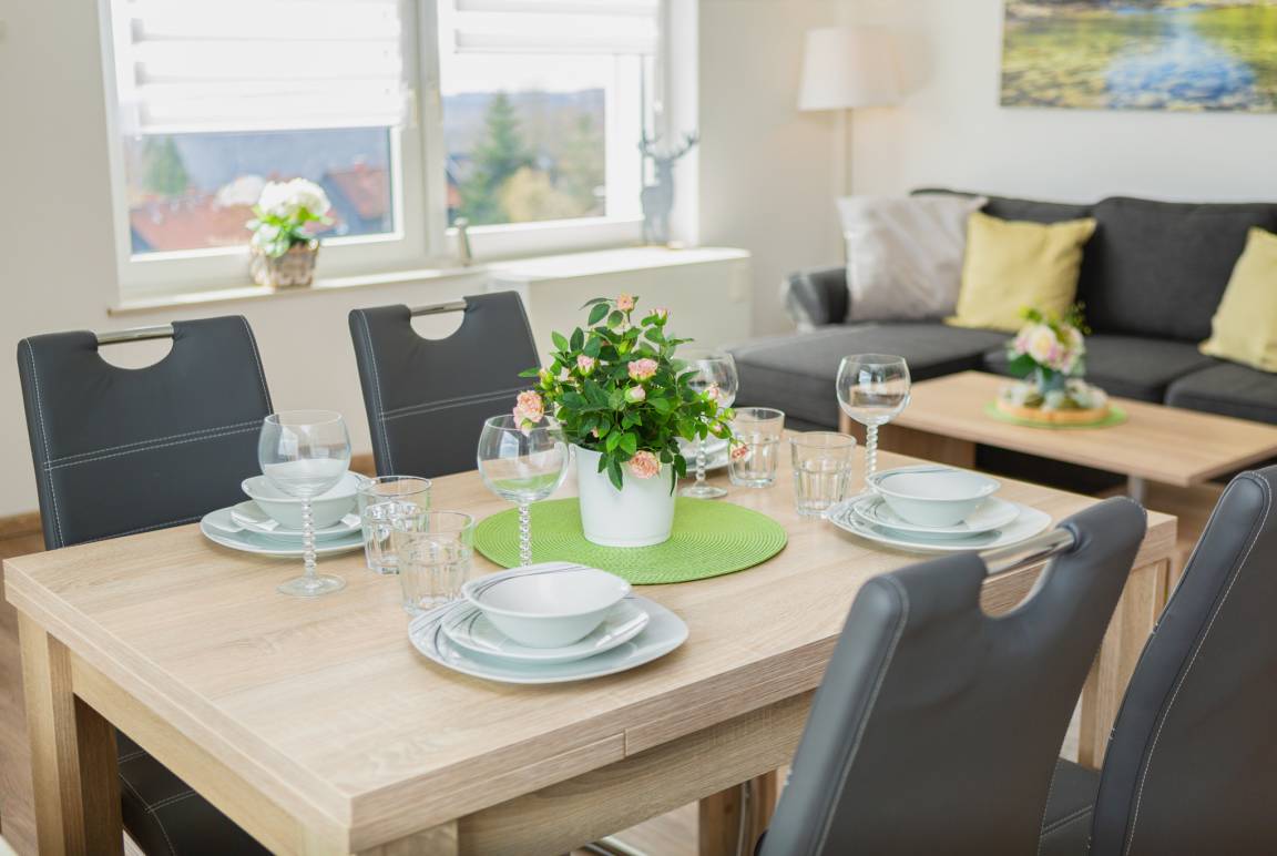 Die Wohnung wurde komplett neu saniert und modern eingerichtet. Der Wohn/Essbereich verfügt über ein Ecksofa mit Schlaffunktion (Liegefläche 1,30m x 2,00m), 1 Sessel, Smart TV (1,40m Diagonale), ausziehbaren Esstisch mit 4 Stühlen und der offenen Küche. Der Balkon ist direkt von hier aus erreichbar und lockt mit seinem schönen Ausblick zum Verweilen an der gesunden Harzer Luft.