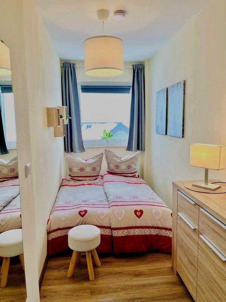 Es gibt ein Gästezimmer mit Schlafcouch (Liegefläche 1,30 x 1,90) und kleiner Komode und ein Schlafzimmer mit Doppelbett (1,80m x 2,00m) und Kleiderschrank.