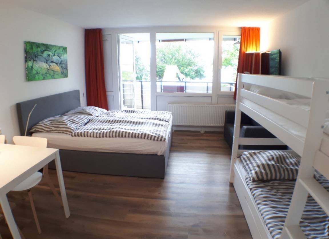 Das 33m² großes Apartment bietet Platz für bis zu 5 Personen, die auf einem bequemen Boxspringbett (ca.160 cm x 200 cm) und einem Etagenbett nebst Ausziehbett (jeweils ca. 90cm × 200 cm) übernachten können.