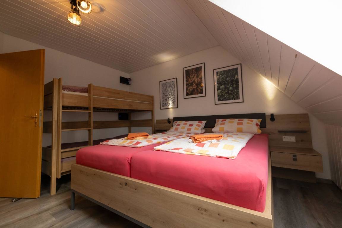 Über den Trippel und eine weitere Treppe kommen Sie in die neu renovierte Ferienwohnung Sternenhimmel im Dachgeschoss. Sie bietet Platz für 2-7 Personen mit hellen und großzügig geschnittene Räumen unter dem typisch weit herunterragenden Schwarzwälder Walmdach.