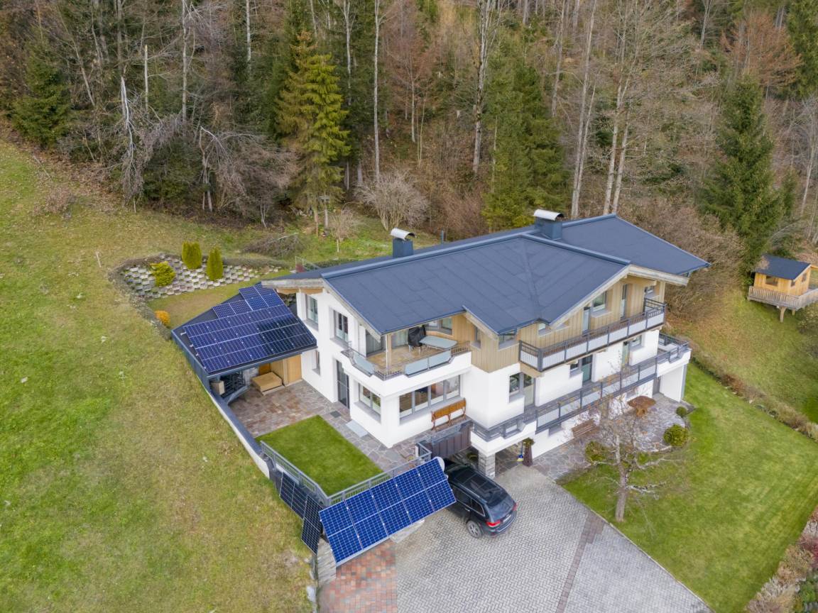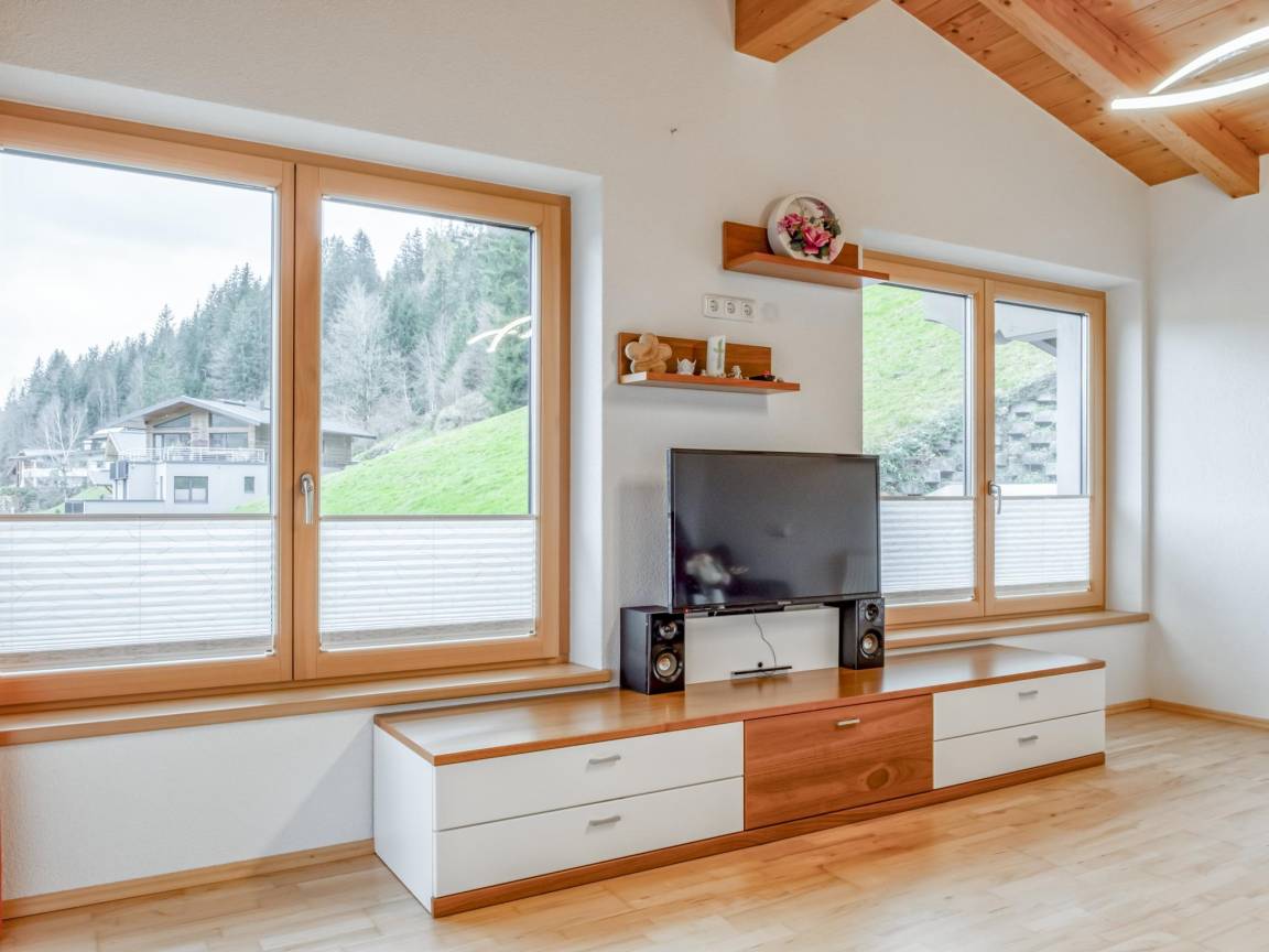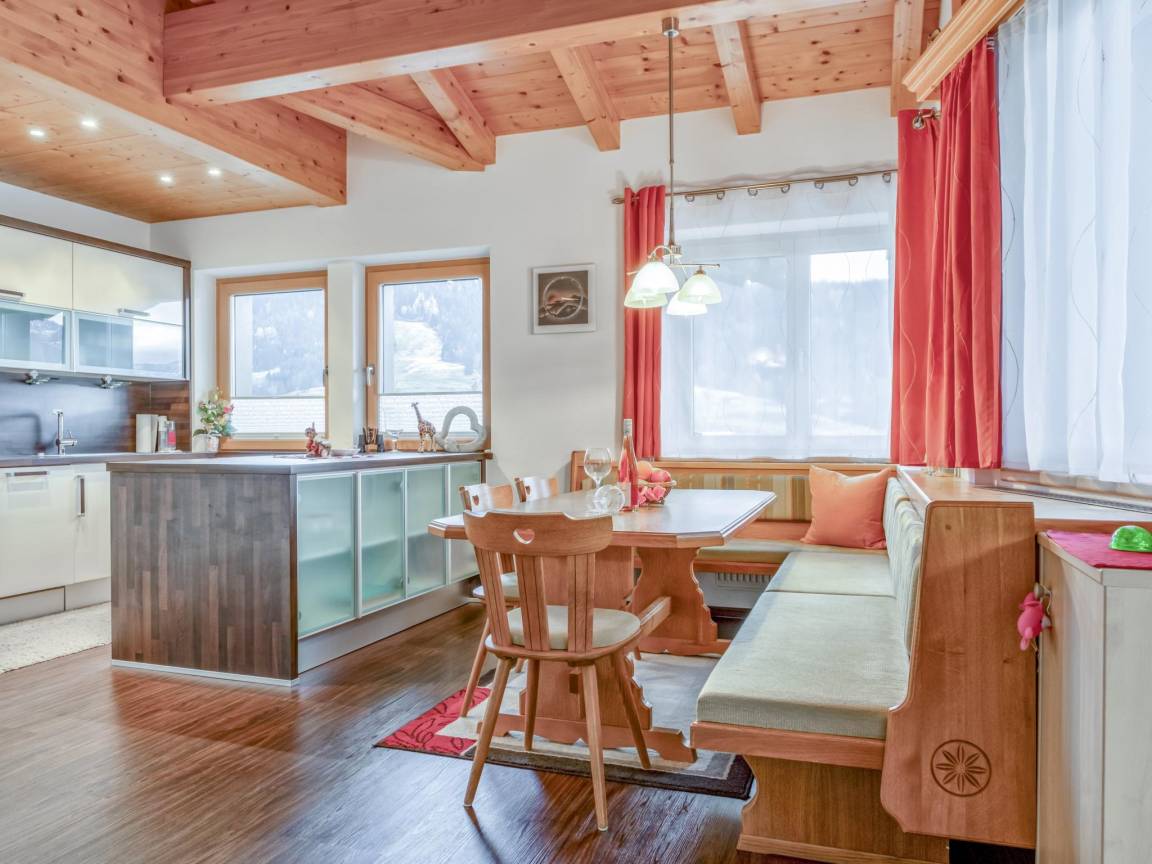 Hausbeschreibung : Die 100m² große Ferienwohnung für 5 Personen bietet 3 Schlafzimmer, ein Badezimmer mit Dusche, WC und Waschbecken sowie ein Wohn-Esszimmer mit gemütlicher Sitzecke, TV und einer offenen, voll ausgestatteten Küche. Die Terrasse lädt zum Entspannen ein und bietet einen traumhaften Ausblick auf das Jakobskreuz. Die Wohnung liegt auf der Sonnenseite, der Skibus ist nur 110m entfernt. Ein Erlebnispark ist fußläufig erreichbar und der Pillersee in wenigen Minuten mit dem Auto