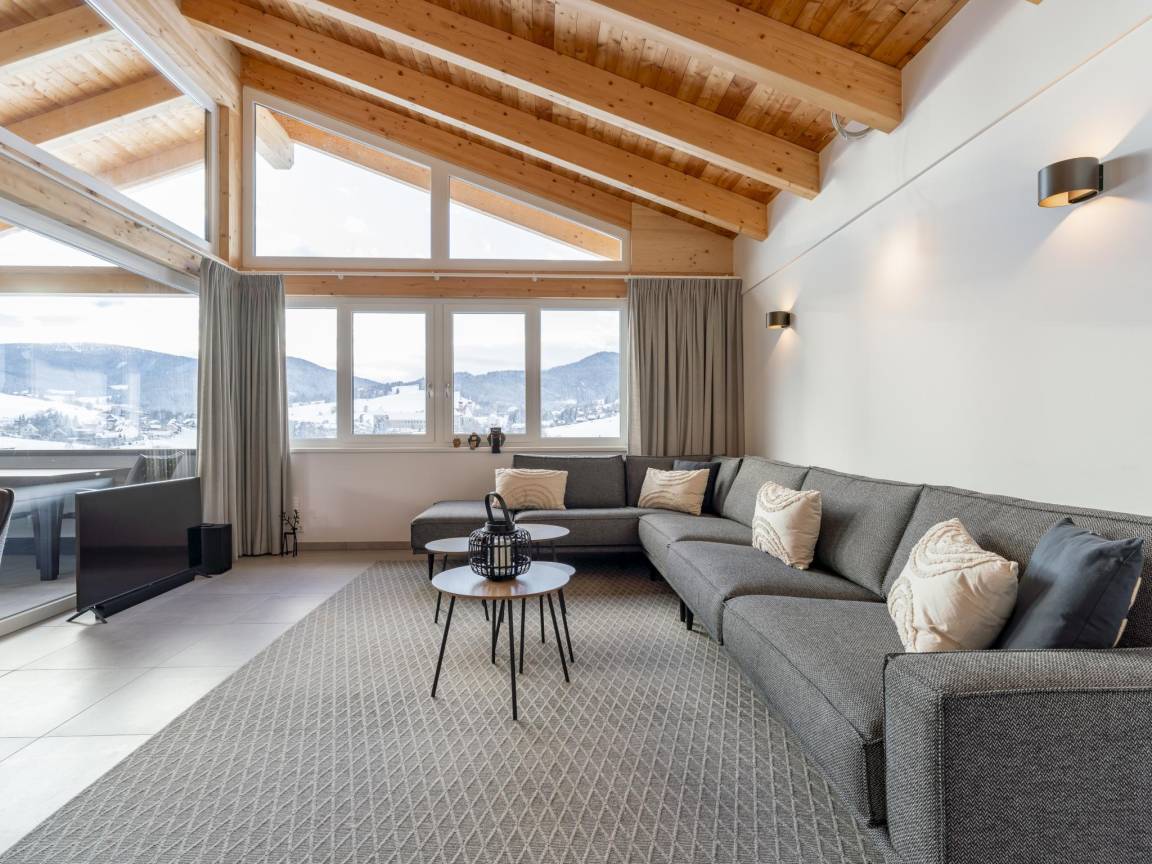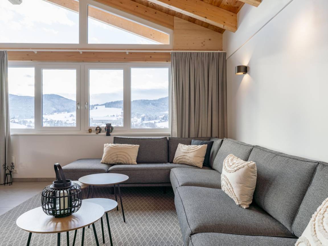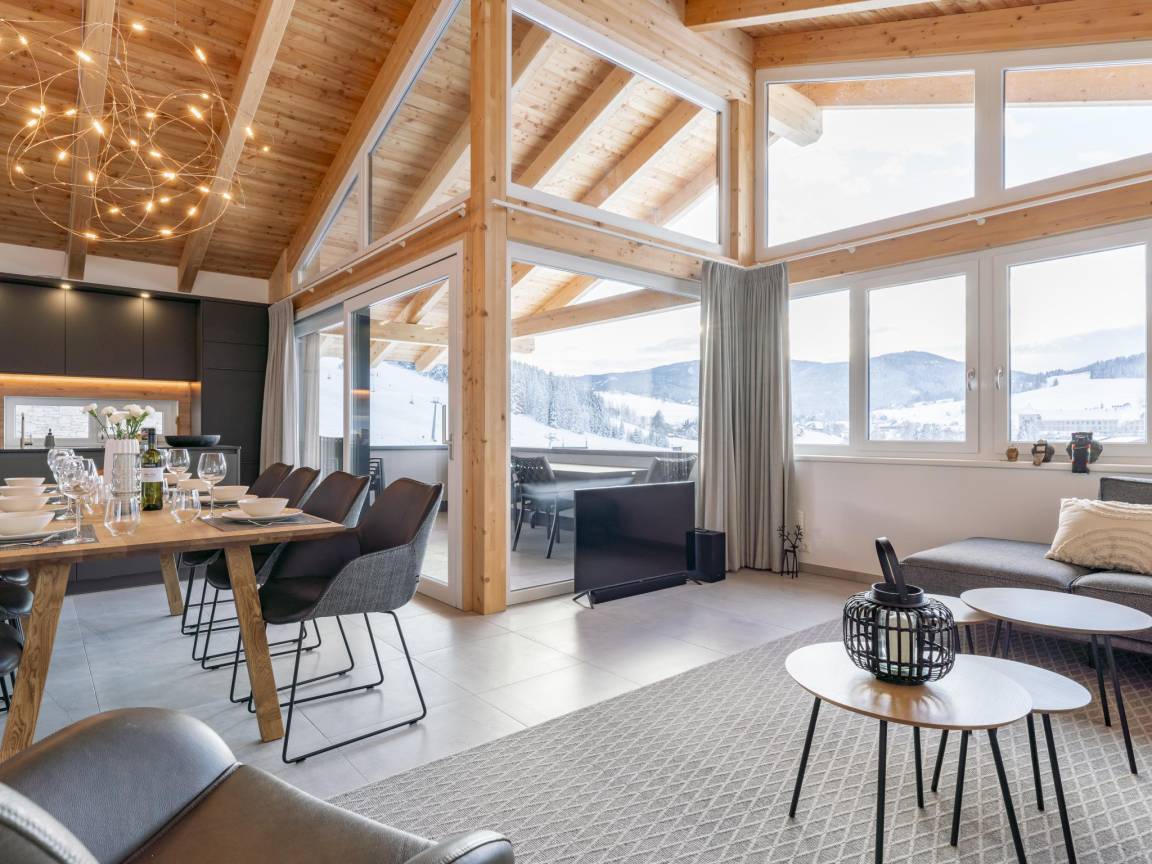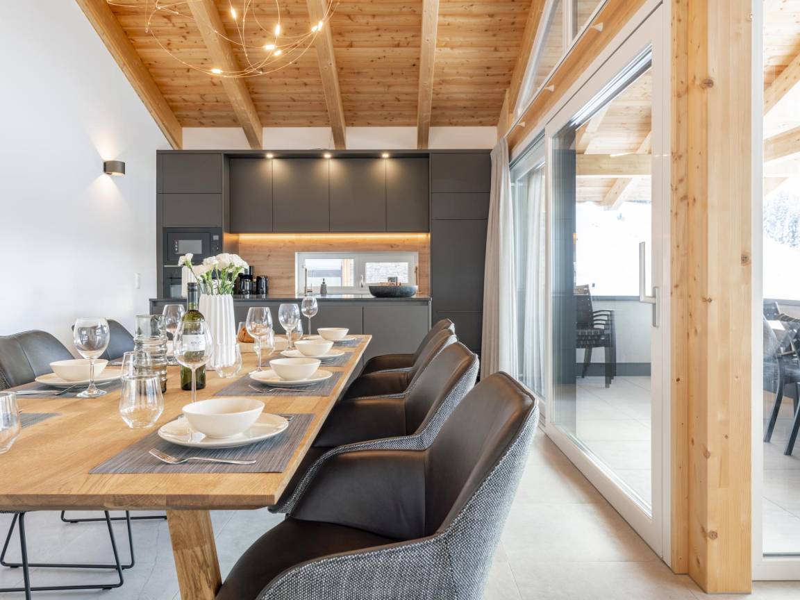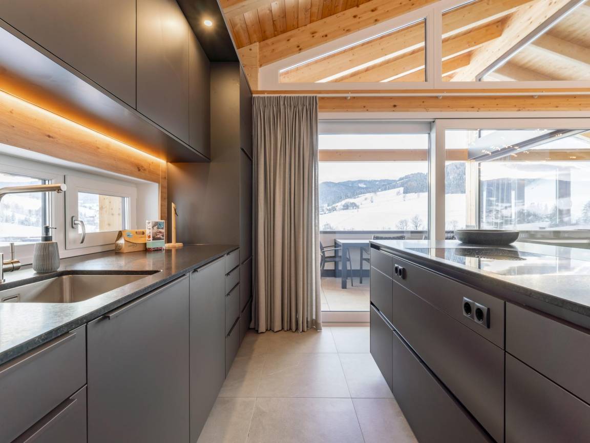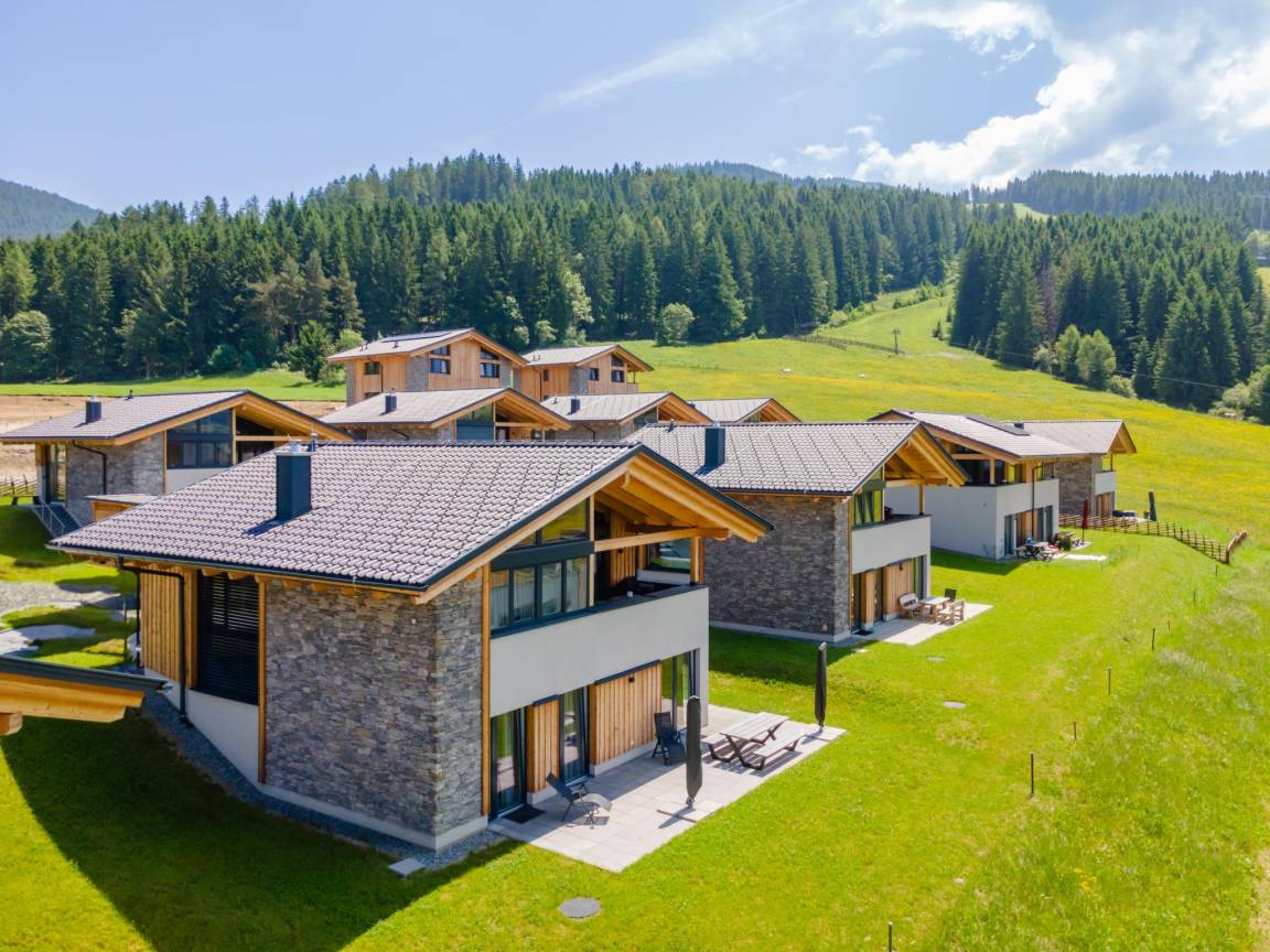 Hausbeschreibung : Dieses luxuriöse Ferienhaus befindet sich direkt an der Skipiste des Skigebiets Grebenzen in Sankt Lambrecht. Aufgrund der einzigartigen Bauweise gegen den Berg befindet sich im Obergeschoss das geräumige Wohnzimmer und die luxuriöse Küche. Auf dieser Etage befindet sich auch ein überdachter Balkon mit fantastischer Aussicht. Unter dem Carport ist Platz für zwei Autos, mit extra Stauraum für Skier oder Fahrräder. Die Außenterrasse ist perfekt für lange Sommerabende