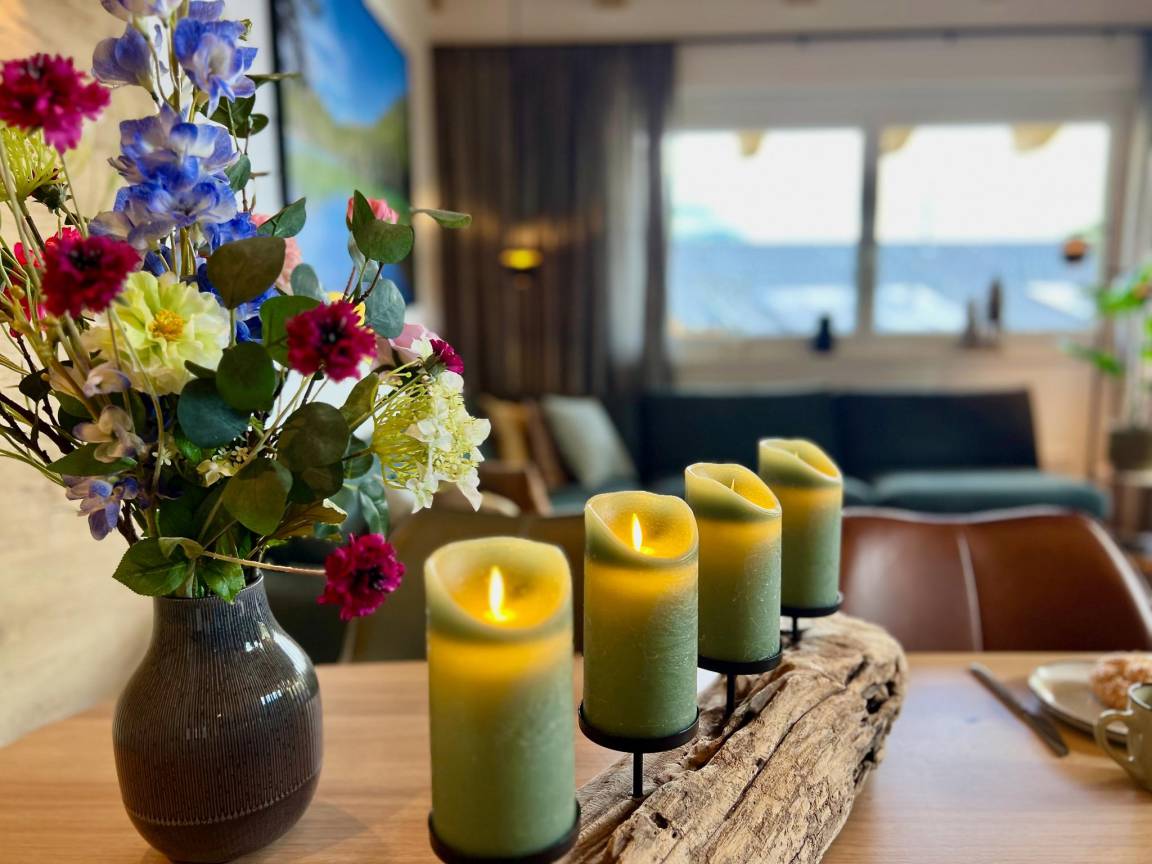 In der 1. Etage: Wohnzimmer mit TV, Esstisch(6 Personen), Sitzecke , offene Küche mit Kochplatte(4 Kochplatten, Induktion), Wasserkocher, Dunstabzugshaube, Kaffeemaschine(Filter), Kaffeemaschine(nespresso cups), Backofen, Mikrowelle, Geschirrspüler, Kühl-/Gefrierkombination, Zitruspresse , Schlafzimmer mit Doppelbett(180 x 200 cm), TV(smart TV) , Badezimmer mit Dusche, Waschbecken, Föhn , Toilette mit Toilette , Balkon mit Esstisch(4 Personen)