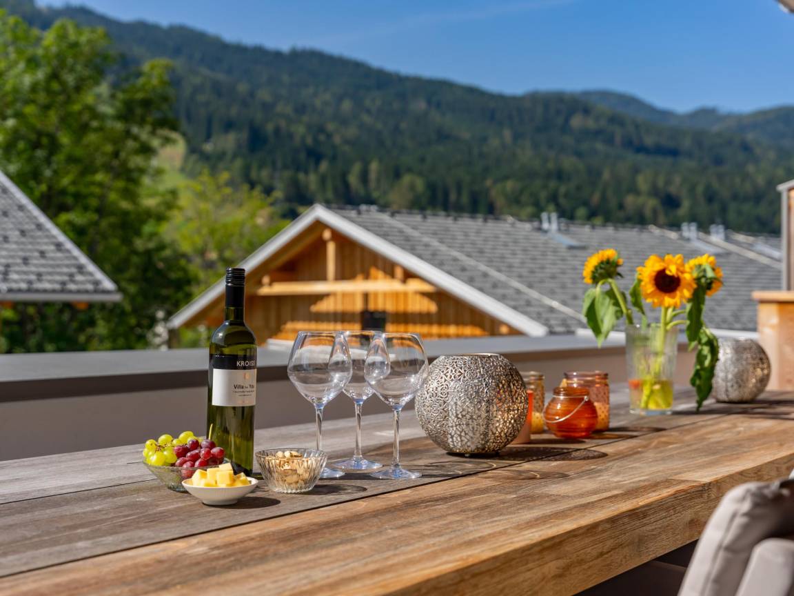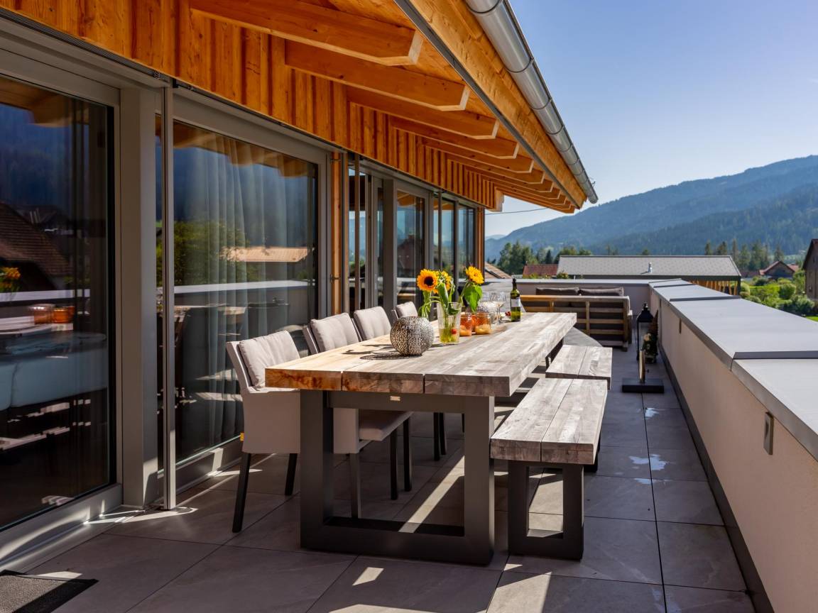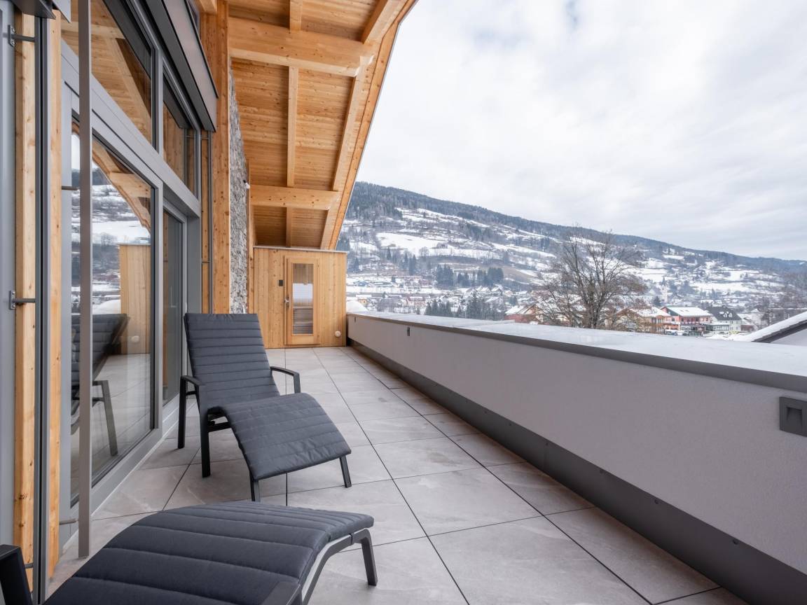 Das Penthouse ist luxuriös und geschmackvoll eingerichtet und verfügt über einen riesigen Balkon mit Sauna und Terrasse, von dem aus Sie einen wunderschönen Blick auf die umliegende Bergwelt genießen können. Die Ferienanlage verfügt über ein Parkhaus, in dem 2 Stellplätze für das Penthouse reserviert sind und ist außen auch noch 1 Parkplatz.
